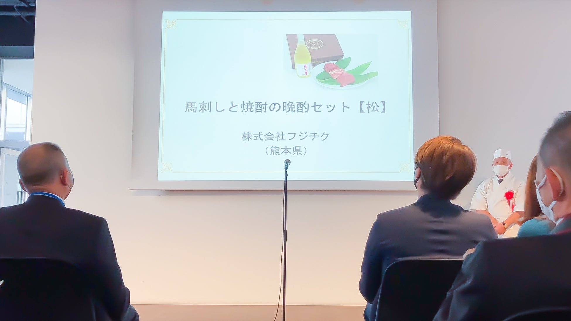 写真1枚目:審査員特別賞を受賞した「馬刺しと焼酎の晩酌セット【松】」展示の様子