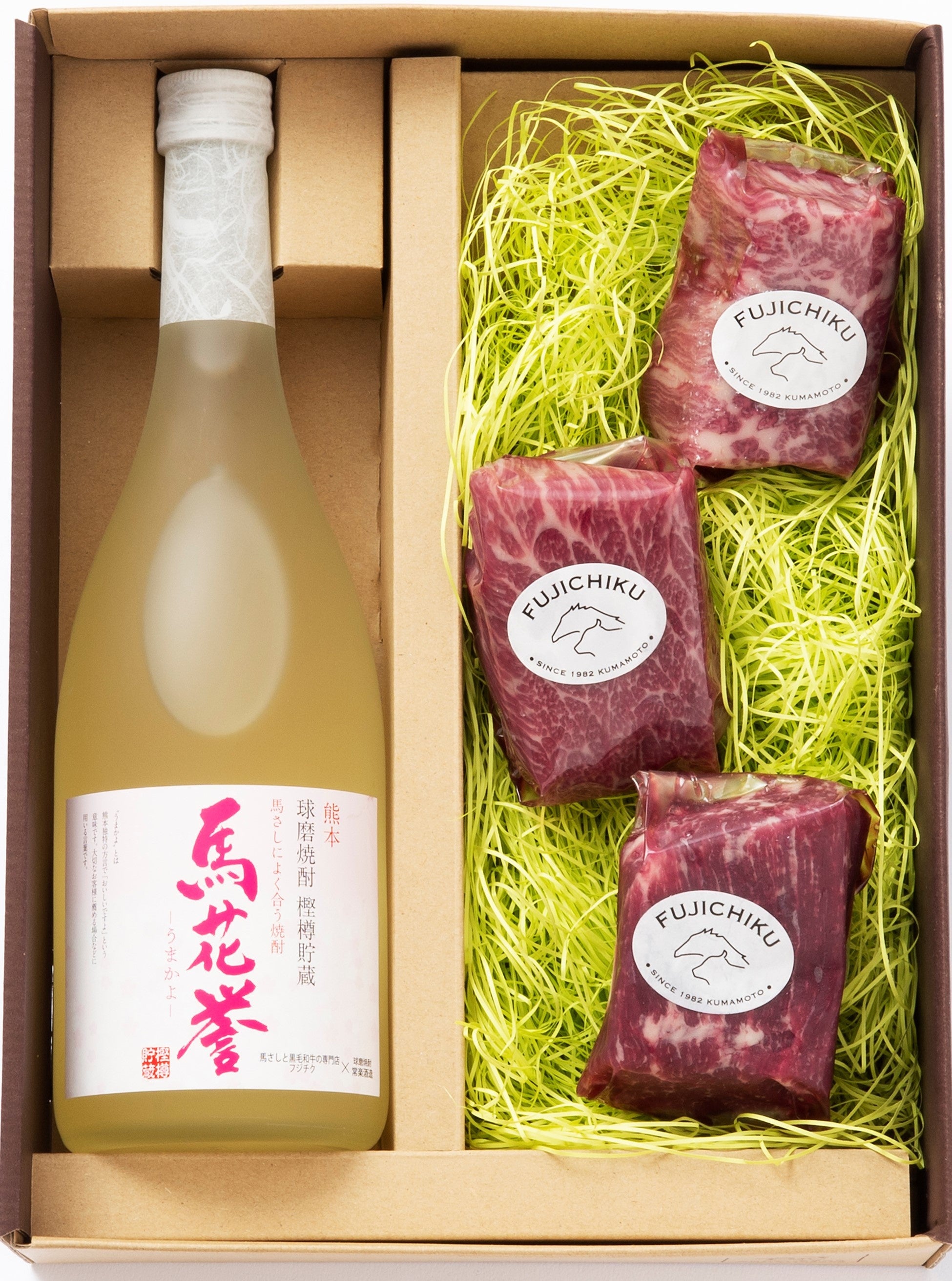特選霜降り馬刺しの大トロを含む人気馬刺しと、馬刺しの旨味をさらに引き立てる本格米焼酎【馬花誉】の原料米も熊本産に厳選しているなど、こだわりの詰まった商品です。