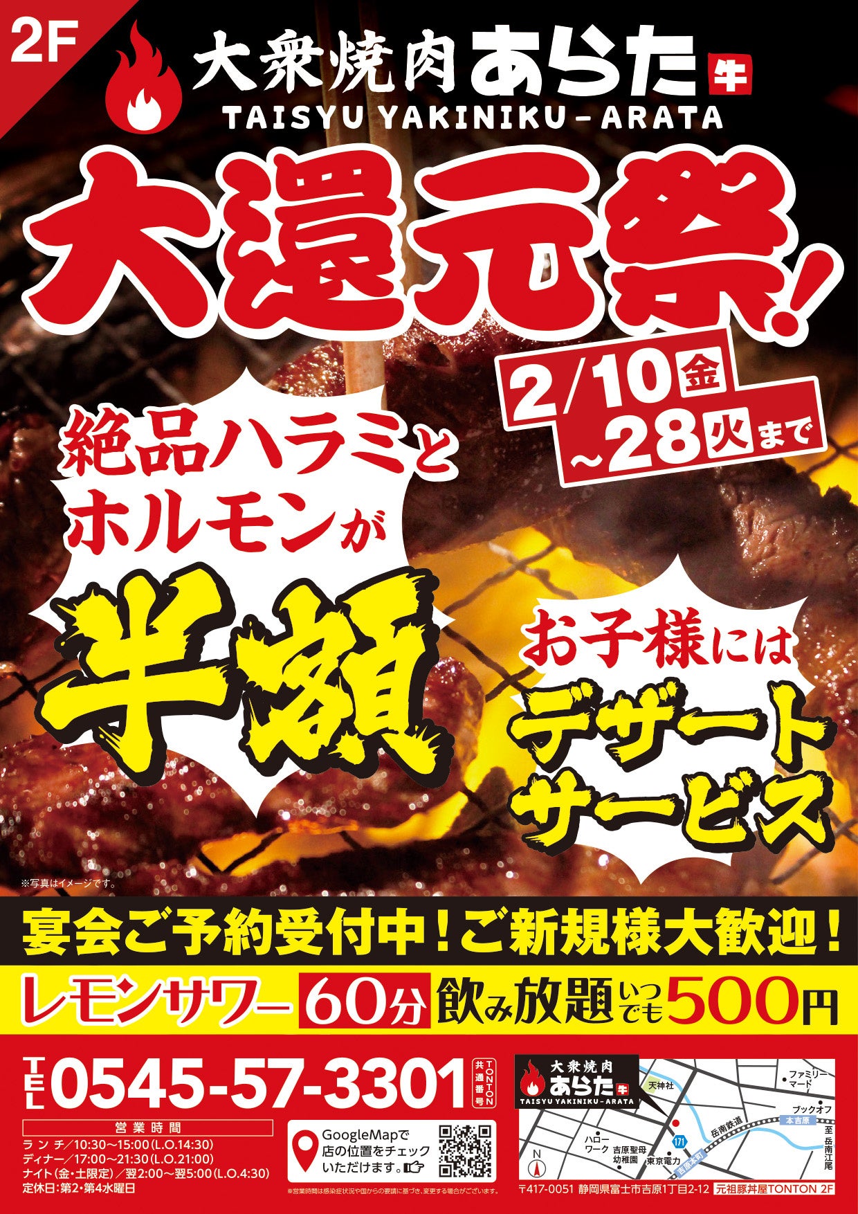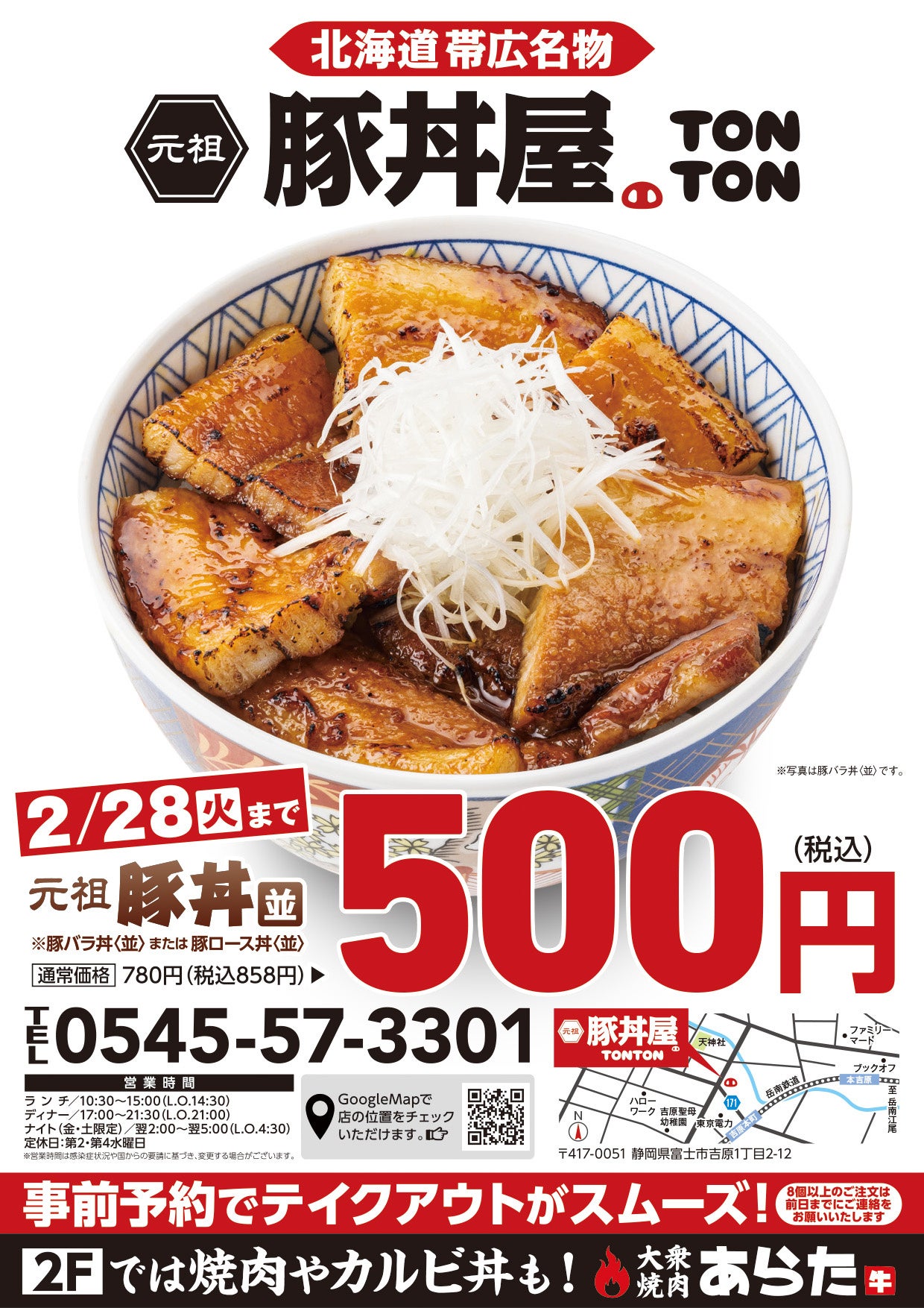 北海道・帯広豚丼が人気の「元祖豚丼屋TONTON 富士吉原店」(住所:静岡県富士市吉原1丁目2-12、TEL:0545-57-3301)では、2/28まで「豚丼【並】」を期間限定価格で提供、店舗2階「大衆焼肉あらた」でも2/10〜28の期間中ハラミとホルモンを半額で提供いたします。
