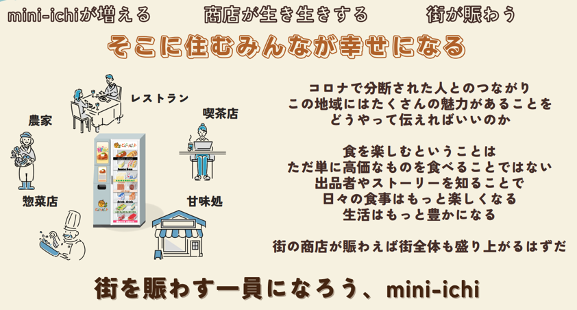 mini-ichi(ミニイチ)は、公共施設や商用ビルなどに設置したIoT冷蔵庫型販売機を用いて、地元自慢の商品をディスプレイしながらリアルで販売することができ、会員登録をした地域住民がキャッシュレスにてその場で購入することができる食の売買サービスです。地元の食の魅力を発見することで、実際のお店に足を運んでもらうきっかけを作り、地産地消を促進するだけでなく、街のにぎわいを作り出す新たな取り組みです。