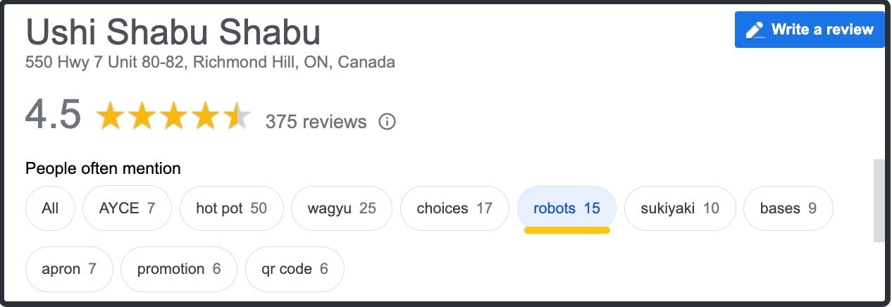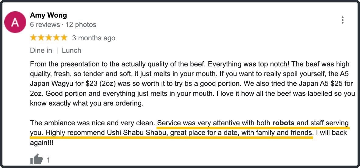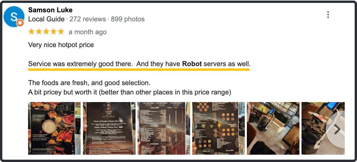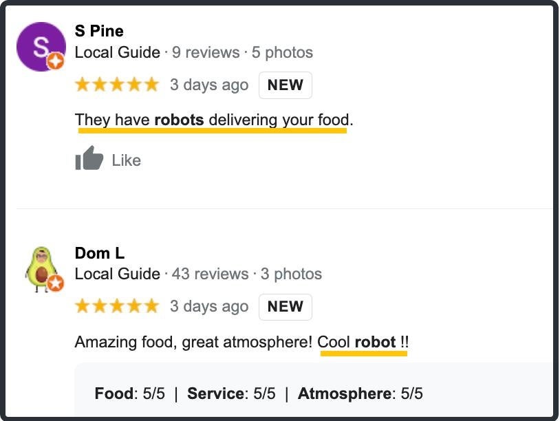 Google レビューでは、平均評価が 4.5 に達し、「robots」 は最も頻繁に言及される言葉の一つになりました。
