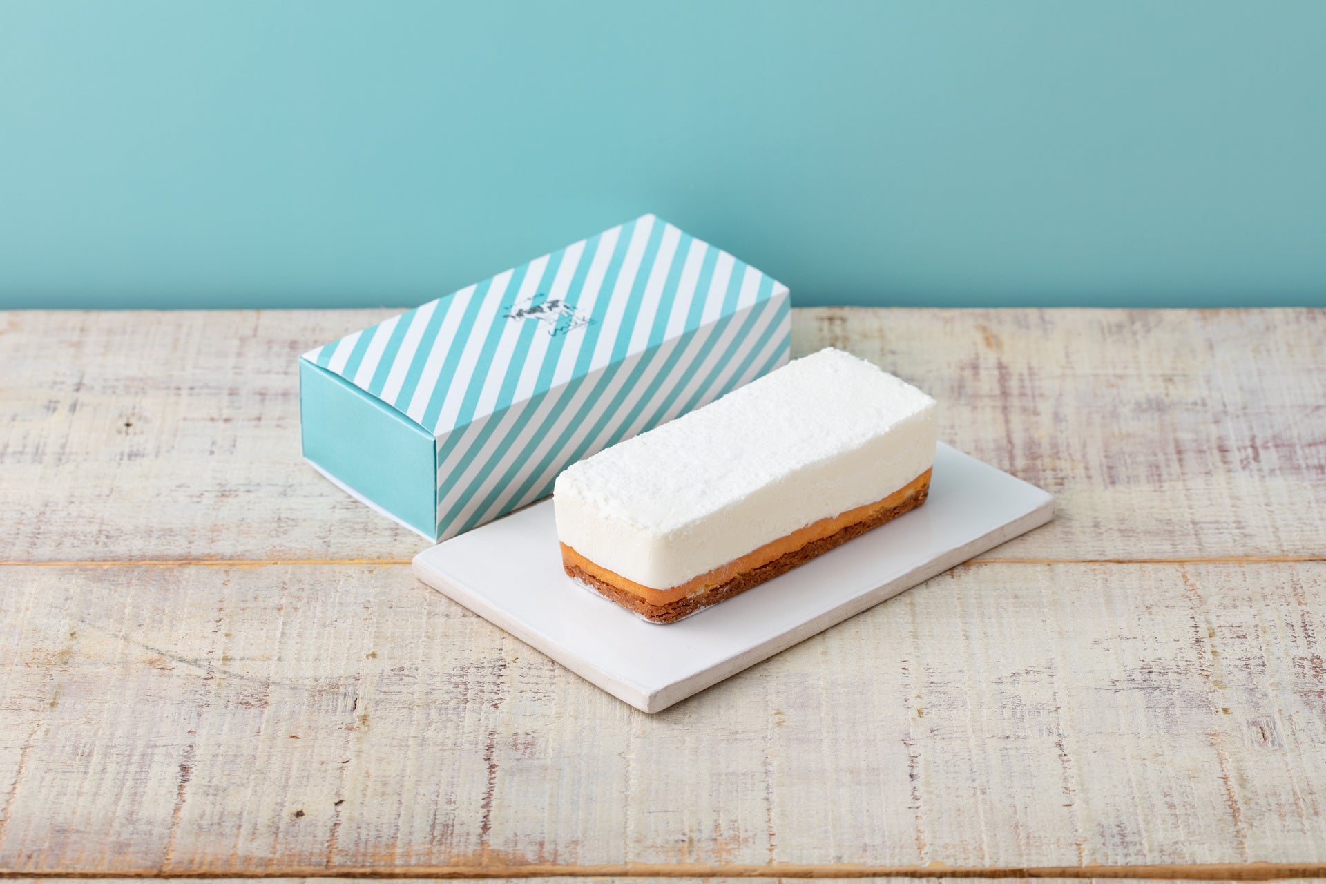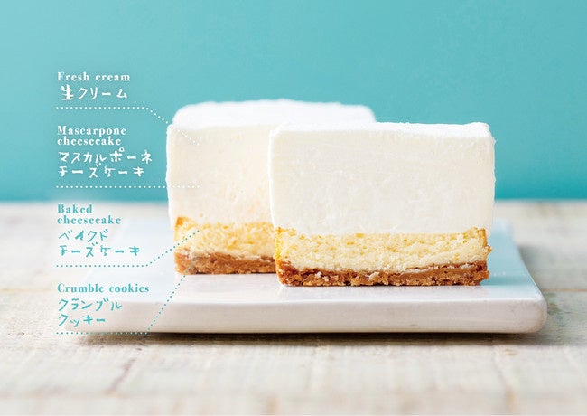 北海道産の生クリームとマスカルポーネチーズを使用した、ミルク感引き立つ「レアチーズ層」と、しっかりとした味わいの「ベイクドチーズ層」、ザクザクの「クッキー生地」を贅沢に一口で楽しめるチーズケーキ。