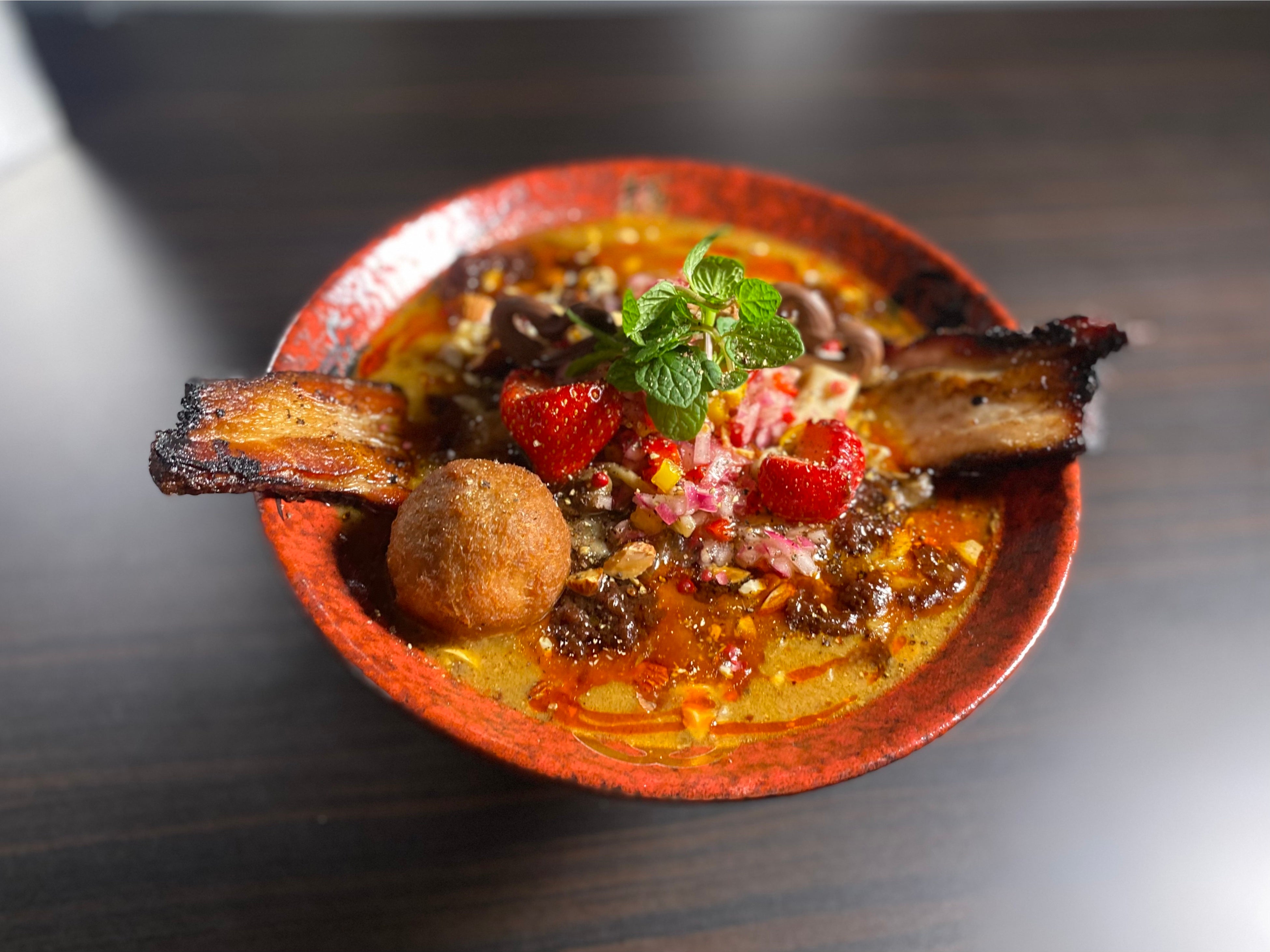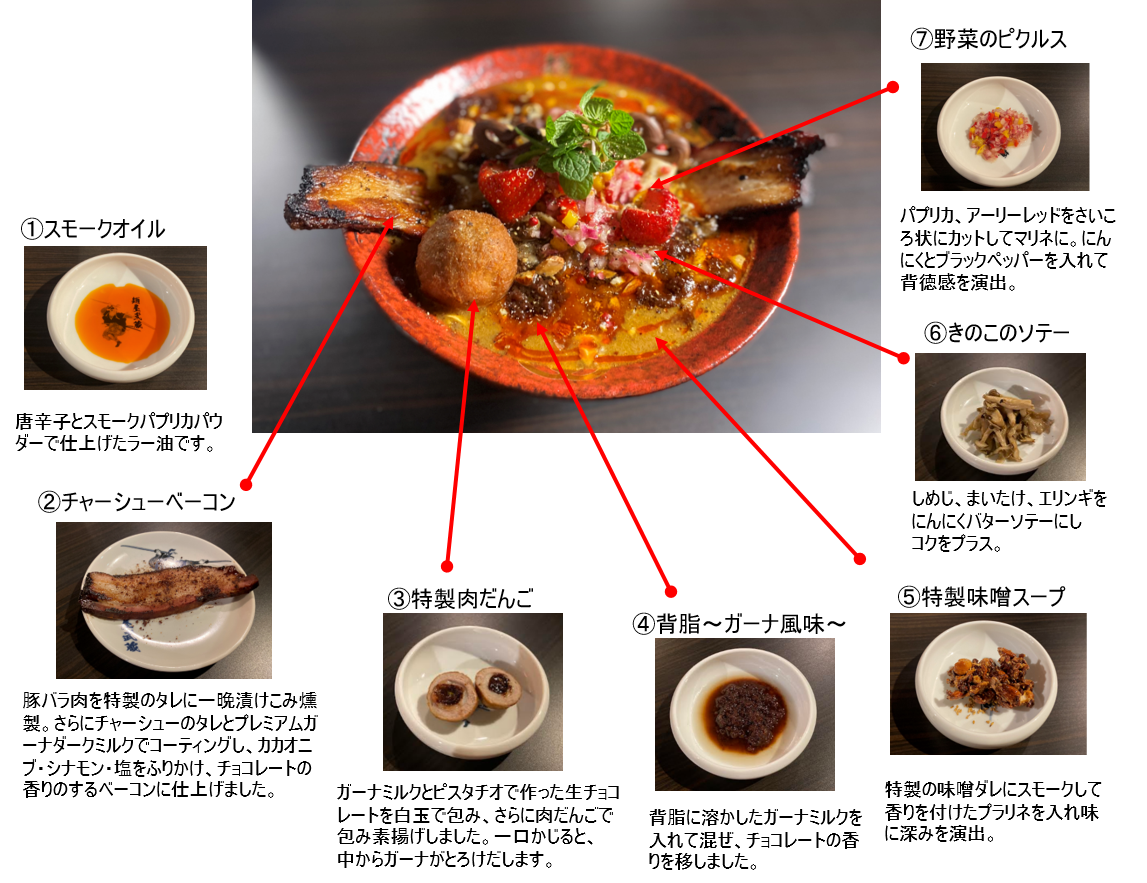 チョコラーメンの取り組みを始めて15年目の今年は、初心にかえり、初年度に展開した「味噌ラーメン」をベースに今年版「背徳感」をプラスし展開いたします。1杯でガーナミルクを約0.7枚使用。燻製したベーコンにプレミアムガーナダークミルクとチャーシューのタレをコーティングしたチャーシューベーコンや、生チョコレートをとじこめた特製肉だんごなど、すべての要素が重なり合うことで味に深みを出しています。ぜひお試しください。