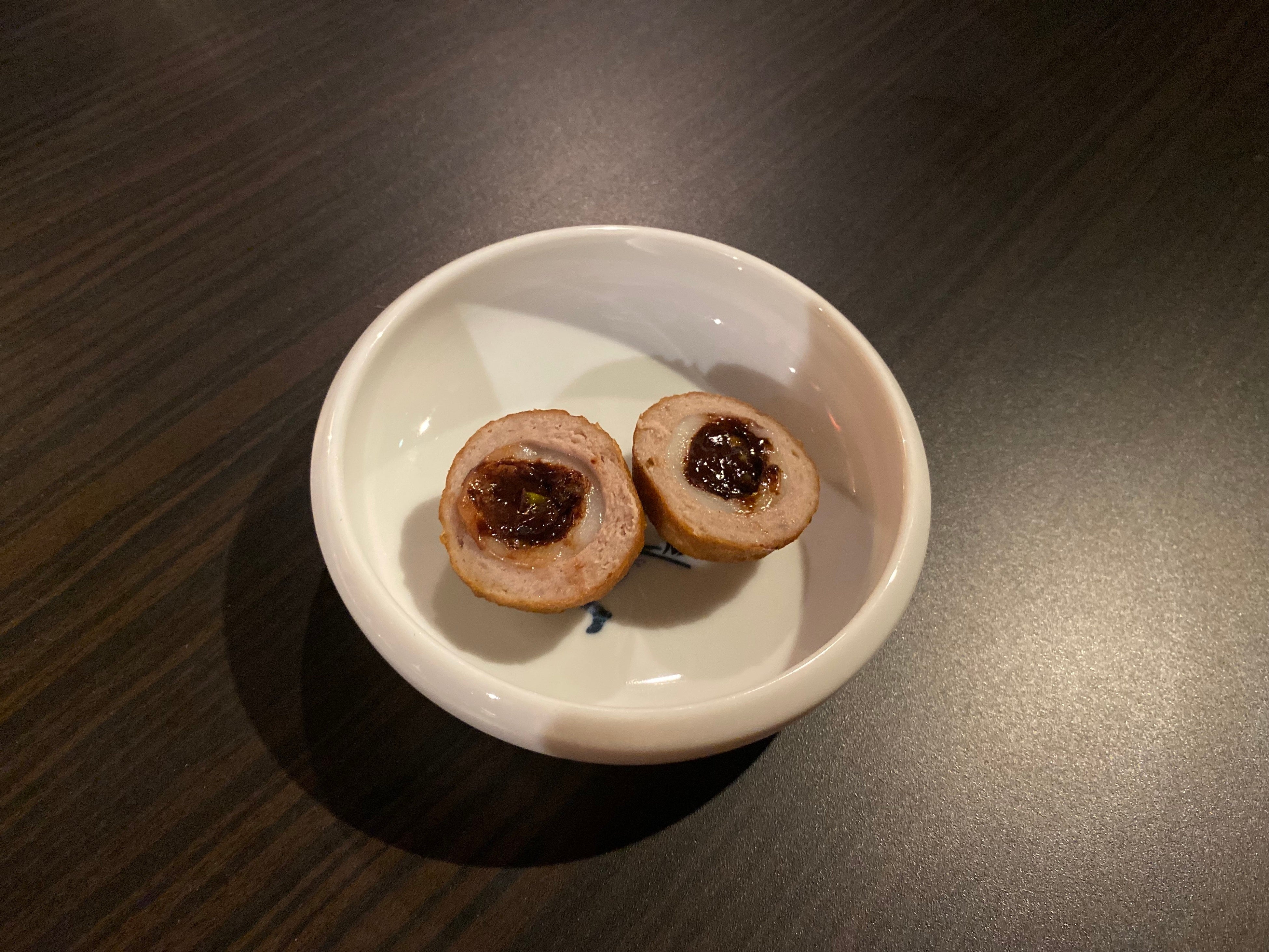- 特製肉だんごは、ガーナミルクとピスタチオで作った生チョコレートを白玉で包み、さらに肉だんごで包み素揚げしました。一口かじると、中からガーナがとろけだします。