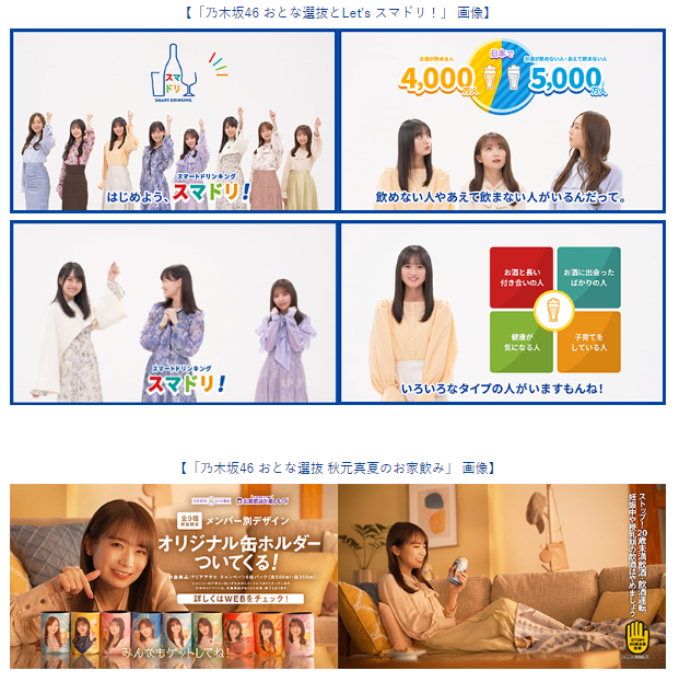 また適正飲酒啓発動画の第4弾として「おとな選抜 適正飲酒講座」を2月3日からWEB限定で配信開始します。今回の動画では秋元真夏さんと梅澤美波さんが講師に扮し、視聴者と一緒に“正しい、楽しいお酒の飲み方”を学んでいきます。居酒屋編では鈴木絢音さん、久保史緒里さん、賀喜遥香さんと飲酒の注意点を学び、お家飲み編では山下美月さん、与田祐希さん、遠藤さくらさんと学びます。これまで「おとな選抜 適正飲酒講座」シリーズは2021年9月から配信してきましたが、2023年月1時点で累計355万回を超える再生を記録しています。さらに、当社が取り組むスマートドリンキング※(通称:スマドリ)を推進するために、新たなWEB限定動画「おとな選抜とLet’s スマドリ!」を2月3日から配信開始します。