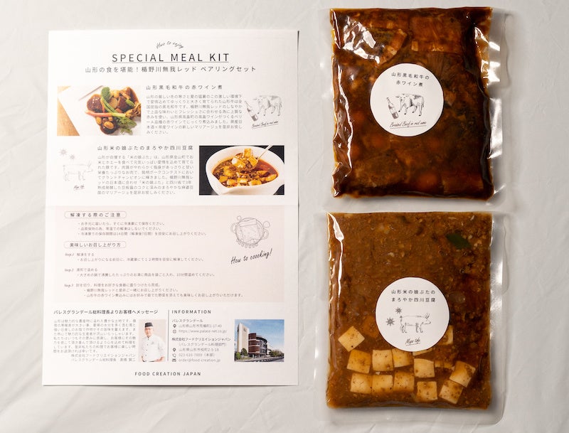 今回のペアリングセットでは、文字通り「山形県」にこだわって設計されました。ミールキットは、普段結婚式やパーティーでの食事提供をはじめ、3つのレストランで山形の食材を中心に、季節を感じられる料理を提供しているフードクリエイションジャパンのシェフの方々が手がけた2種類の料理(山形黒毛和牛の赤ワイン煮・山形米の娘ぶたのまろやか四川豆腐)を一つのセットとしています。また、届いてからの調理方法も簡単。10分程度湯煎するだけで簡単に本格的な料理をご自宅にて味わうことができます。山形の食材に精通しているシェフの方々だからこそ引き出せる山形食材の魅力をご自宅で味わってみてはいかがでしょうか?