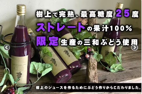 丹波の山々に囲まれた福知山市三和(みわ)町で農薬やホルモン剤を一切使用せずに育てられた三和ぶどう。自然の恵みをたっぷりと受けたぶどうを文字通り1粒1粒厳選して、極上の果実のみで作ったストレート果汁100%ジュースです。
