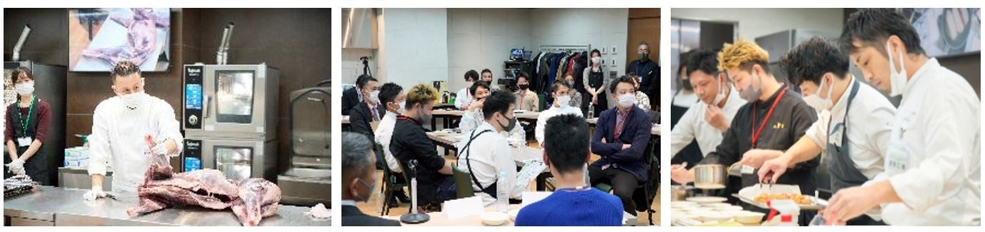 プログラムはシェフが産地を訪れ生産者と交流する「学び」、シェフと加工業者が意見交換する「発散・対話」、シェフにジビエを提供しメニュー開発に取り組んでもらう「実践」、生産者や加工業者、外食・中食に携わる飲食店、消費者に向けて情報発信する「共有」の4タームに分けて行われました。