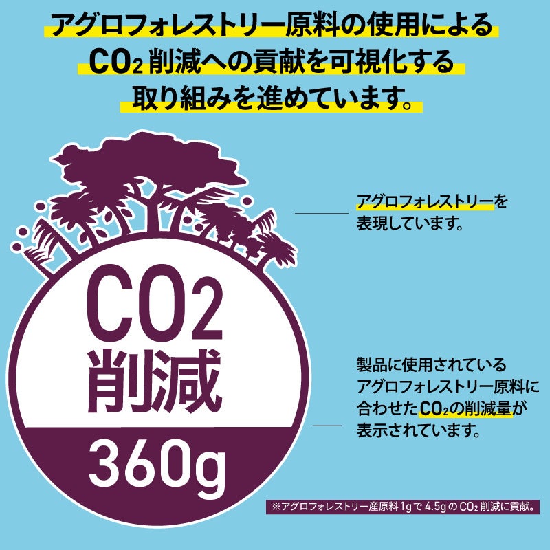 おもにアグロフォレストリーで栽培されたアサイーを使用しており、1製品当たり(2食分)360gのCO₂削減に貢献できます。