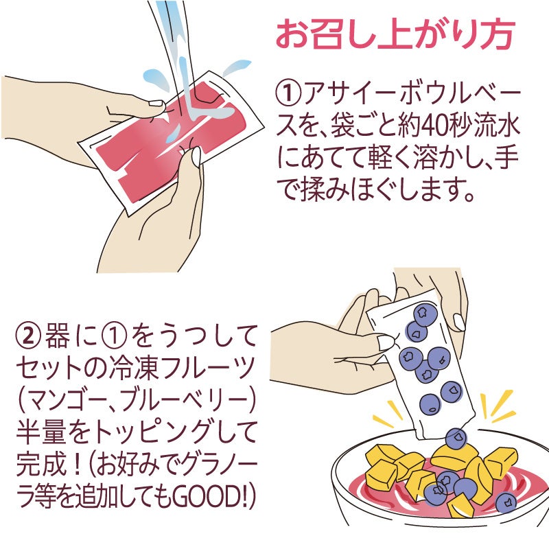 [原材料名]【アサイーボウルベース】アサイーピューレ(ブラジル製造)、バナナピューレ、濃縮ぶどう果汁、濃縮いちご果汁、パッションフルーツ果汁 【冷凍フルーツ】マンゴー、ブルーベリー