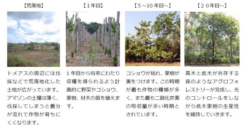 アグロフォレストリーは農作物と樹木を混植する農法の総称で、世界各地で様々な実践例があります。トメアス総合農業協同組合が実践するアグロフォレストリーは、伐採によって荒廃したアマゾンの土地に多様な作物と樹木を植え、20年程の年月をかけて森のように農地を構成していきます。