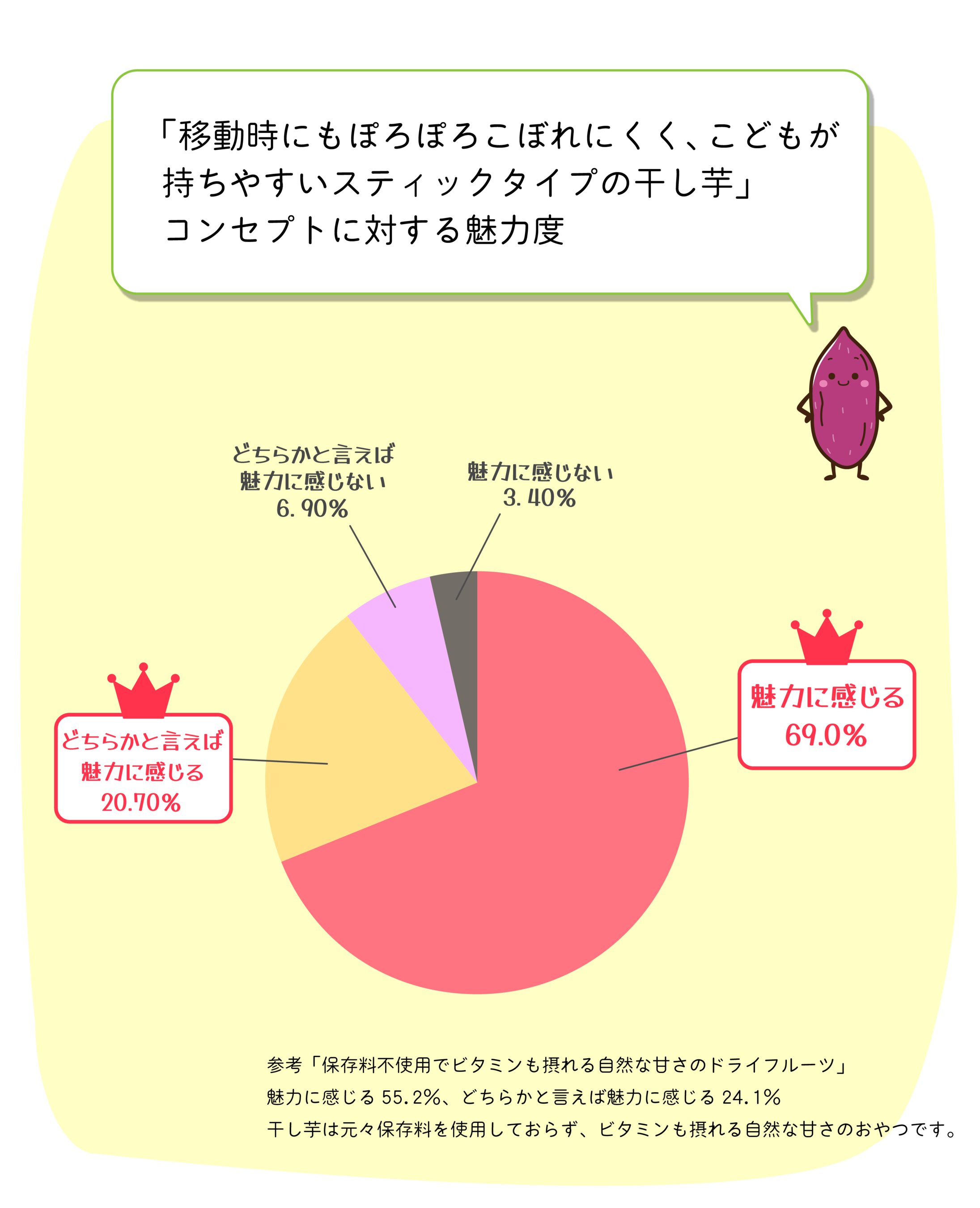 また、「移動時にもぽろぽろこぼれにくく、こどもが持ちやすいスティックタイプの干し芋」があったら魅力に感じますか?という問いにも9割以上の方に魅力を感じていただいています。