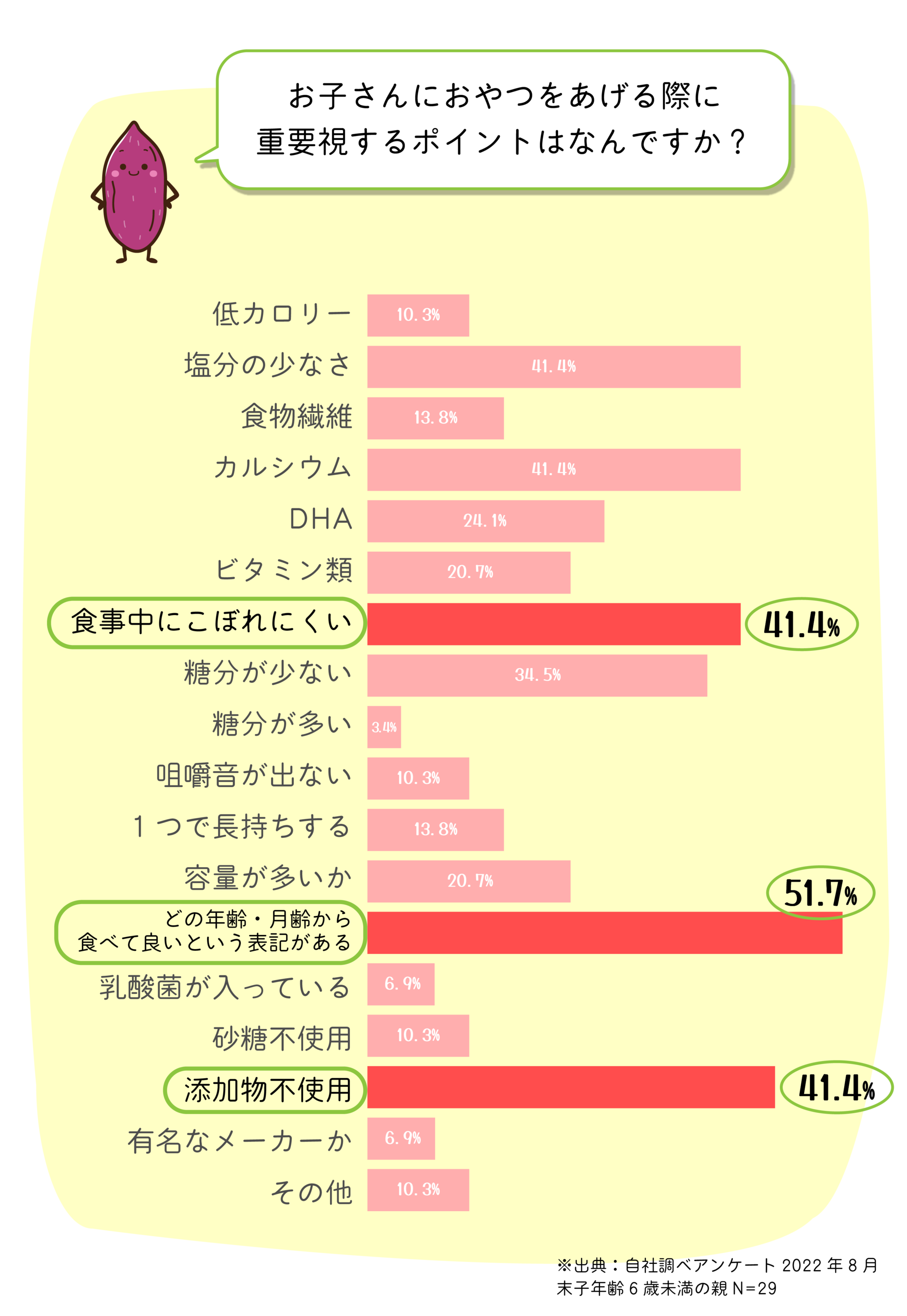 実際に、壮関では未就学児のお子さんを持つママ、パパの声を聴いてみたところ以下のようにスティックタイプの干し芋の持つ特徴はこどものおやつとして求められている要素に当てはまるものばかりでした!