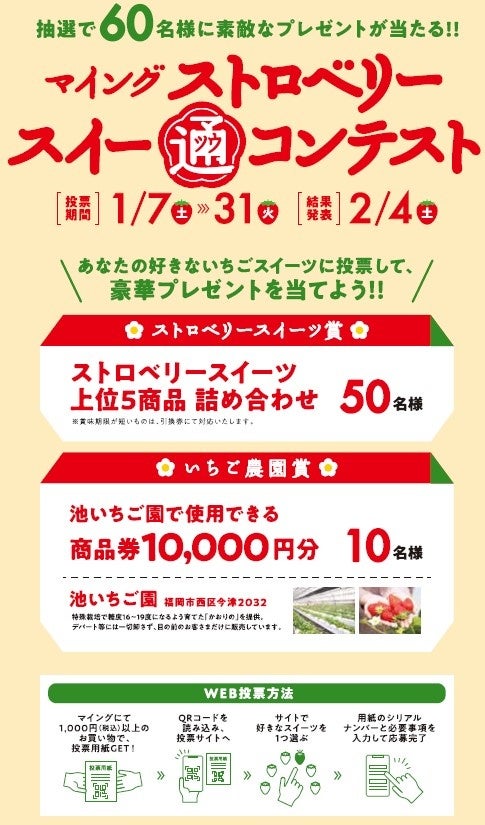 マイング各店舗選りすぐりの博多あまおうをはじめとした「いちご」を使ったスイーツ、27エントリー商品の中から、お客様による投票で人気No.1が決まります。さらに、投票していただいた方の中から抽選で、50名様にコンテスト上位5位のスイーツ詰め合わせ、または10組様にいちご農園で使える商品券10,000円分をプレゼントいたします。