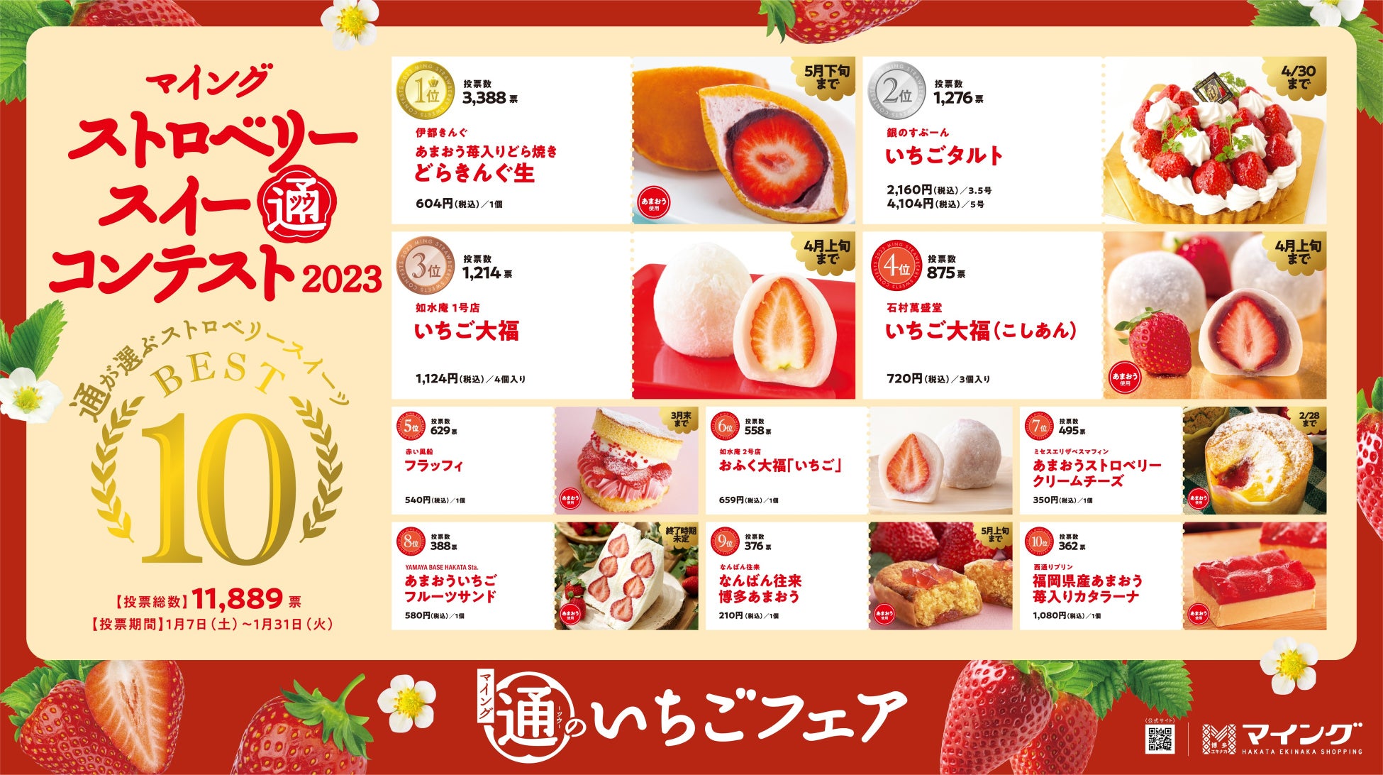 昨年を上回る11,889人の投票を集めた“いちごスイーツ処・マイング”のスイーツコンテスト、1位~10位のいちごスイーツをご紹介いたします。