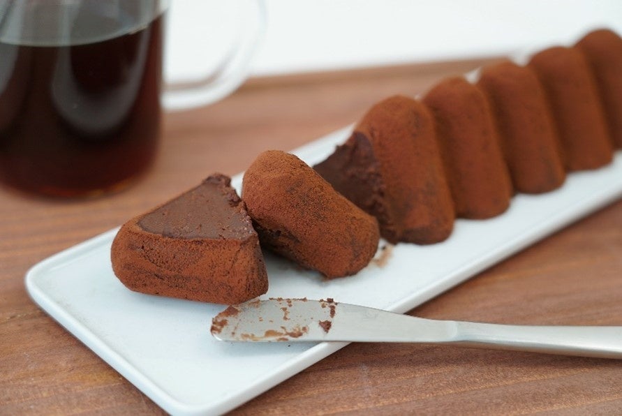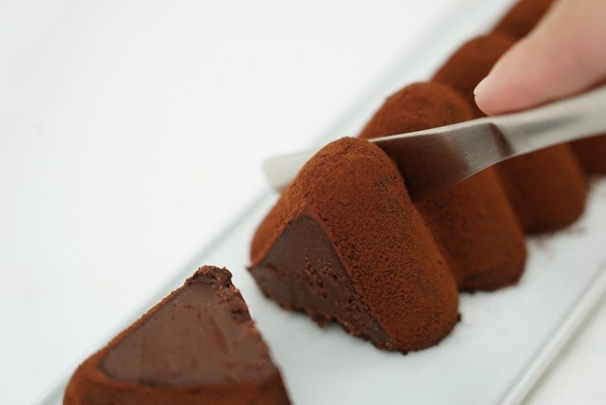 丸形や長方形が定番のガトーショコラの世界に初めて三角形を採用。おにぎりが連なったような特徴的な形は、印象的なだけでなく、同じ量でカットしやすい。冷蔵庫から出して30分程度ですぐに柔らかくなり、フォークで綺麗に切り分けることが出来ます。