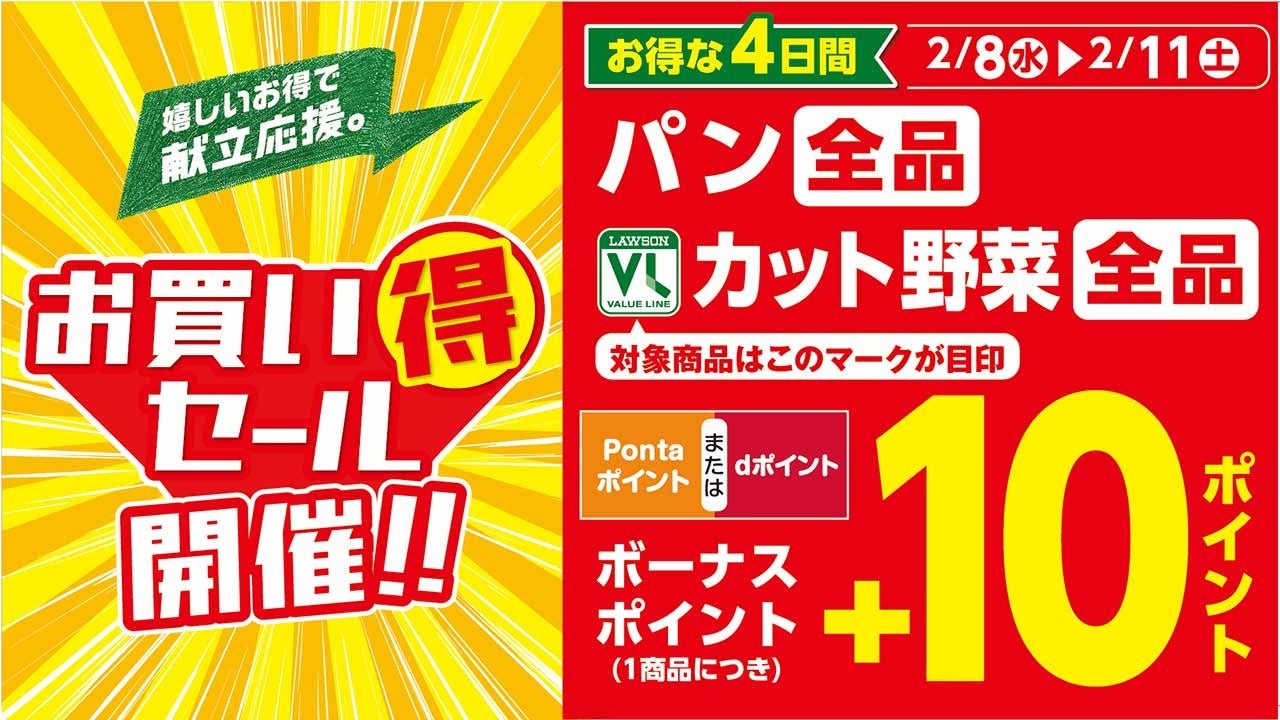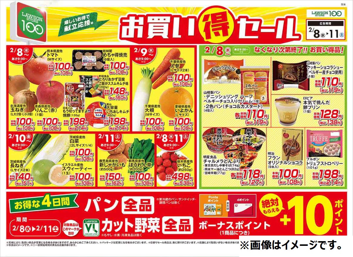 株式会社ローソンストア100(神奈川県川崎市)が運営する「ローソンストア100」(664店舗/2022年12月末現在)では、2023年2月8日(水)から2月11日(土)までの4日間「お買い得セール」を開催いたします。期間中は普段より更にお買い得な野菜や果物を日替わりでご用意。また食品、お菓子なども取り揃えます。更に、パン全品と「VL(Value Line)」のカット野菜各種を対象に、Pontaカードまたはdポイントカードをご提示の上お買上げいただくと、1個購入ごとに10ポイントのボーナスポイントをプレゼントするキャンペーンも同時開催いたします。