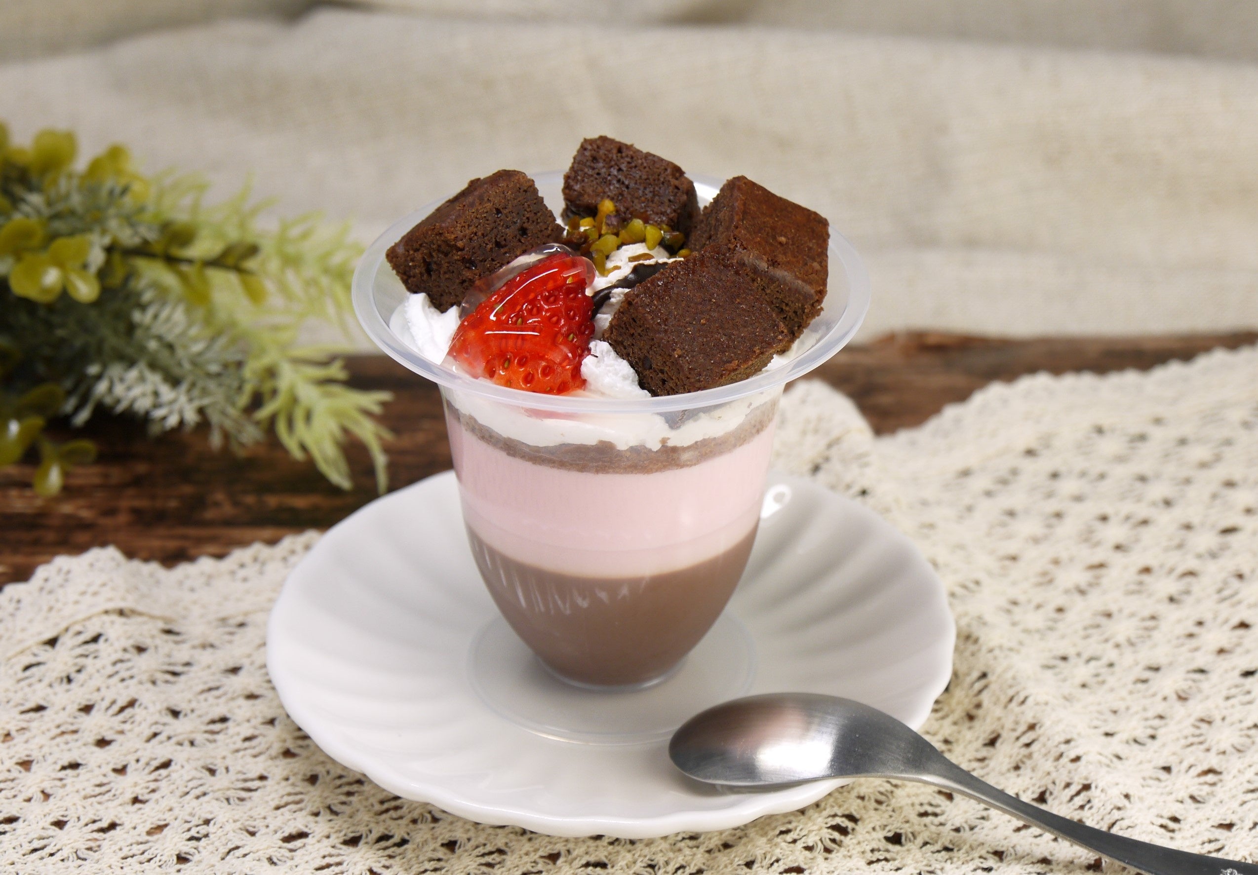 なめらかなチョコレート風味のプリンと軽い口当たりのストロベリームースの上に、ココアスポンジとホイップクリームを重ね、4層に仕立てています。しっとりとした食感のチョコレートブラウニーをふんだんに乗せ、フレッシュ苺をトッピング。グラサージュショコラと刻みピスタチオが味のアクセントになっています。
