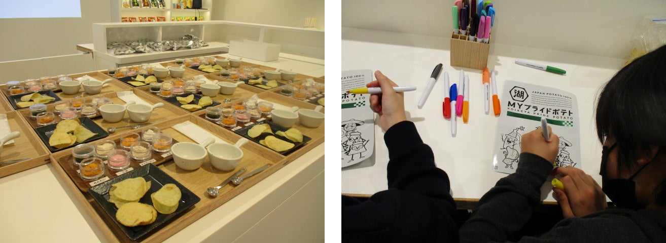 「湖池屋GOGO!ファクトリー」では、フラット、Vカット、ケトル、厚切り等の異なるカット形状のポテトチップス生地をご用意し、食感の違いをお楽しみいただきます。そして、地元・熊本ならではの素材を含めた8種類のフレーバーを組み合わせたオリジナルの味つけをポテトチップス生地にあわせていただけます。お好みのデザインやメッセージを加えることができるパッケージを含めて、世界に1つだけのオリジナルポテトチップスを作っていただくことができます。