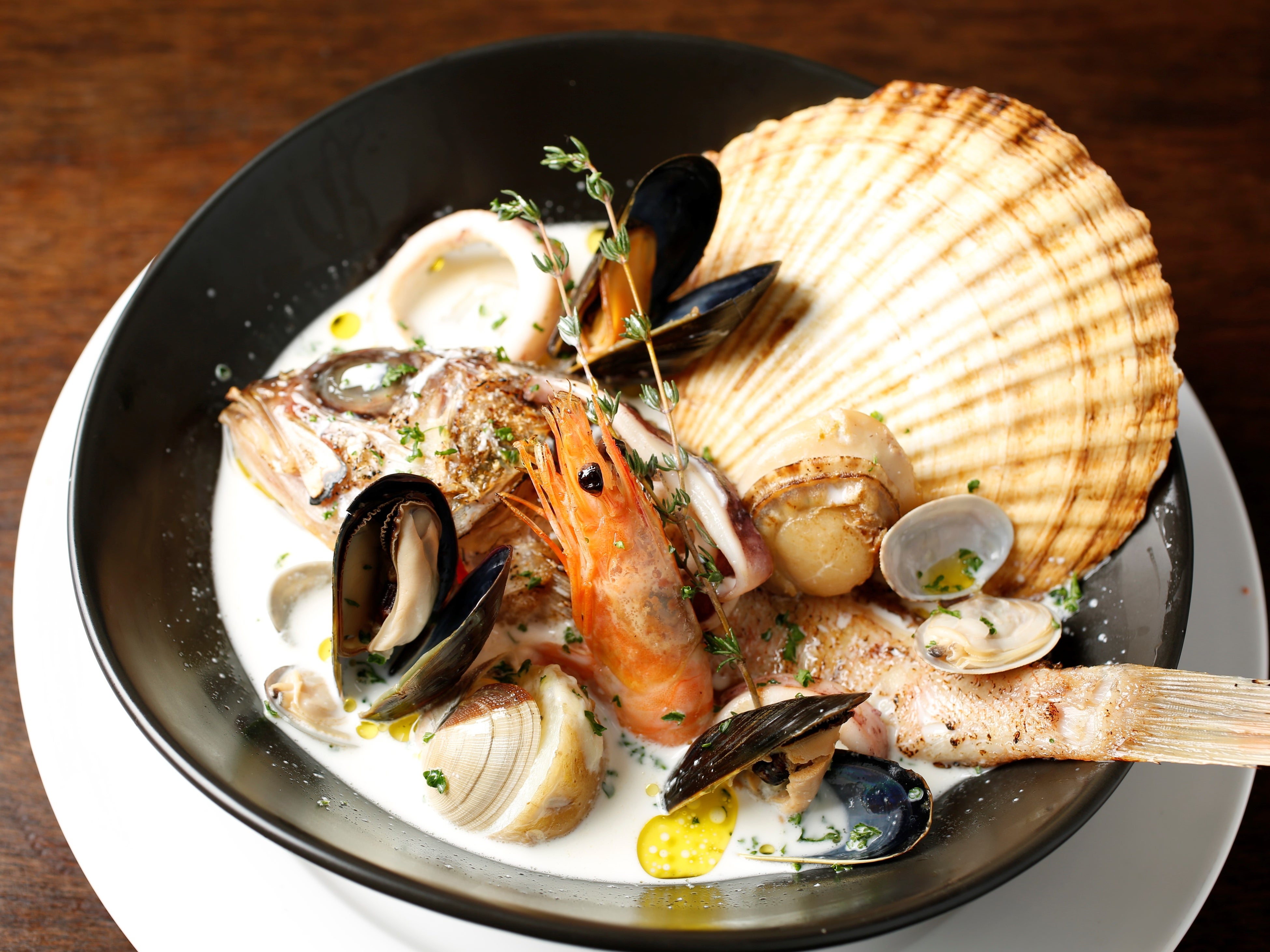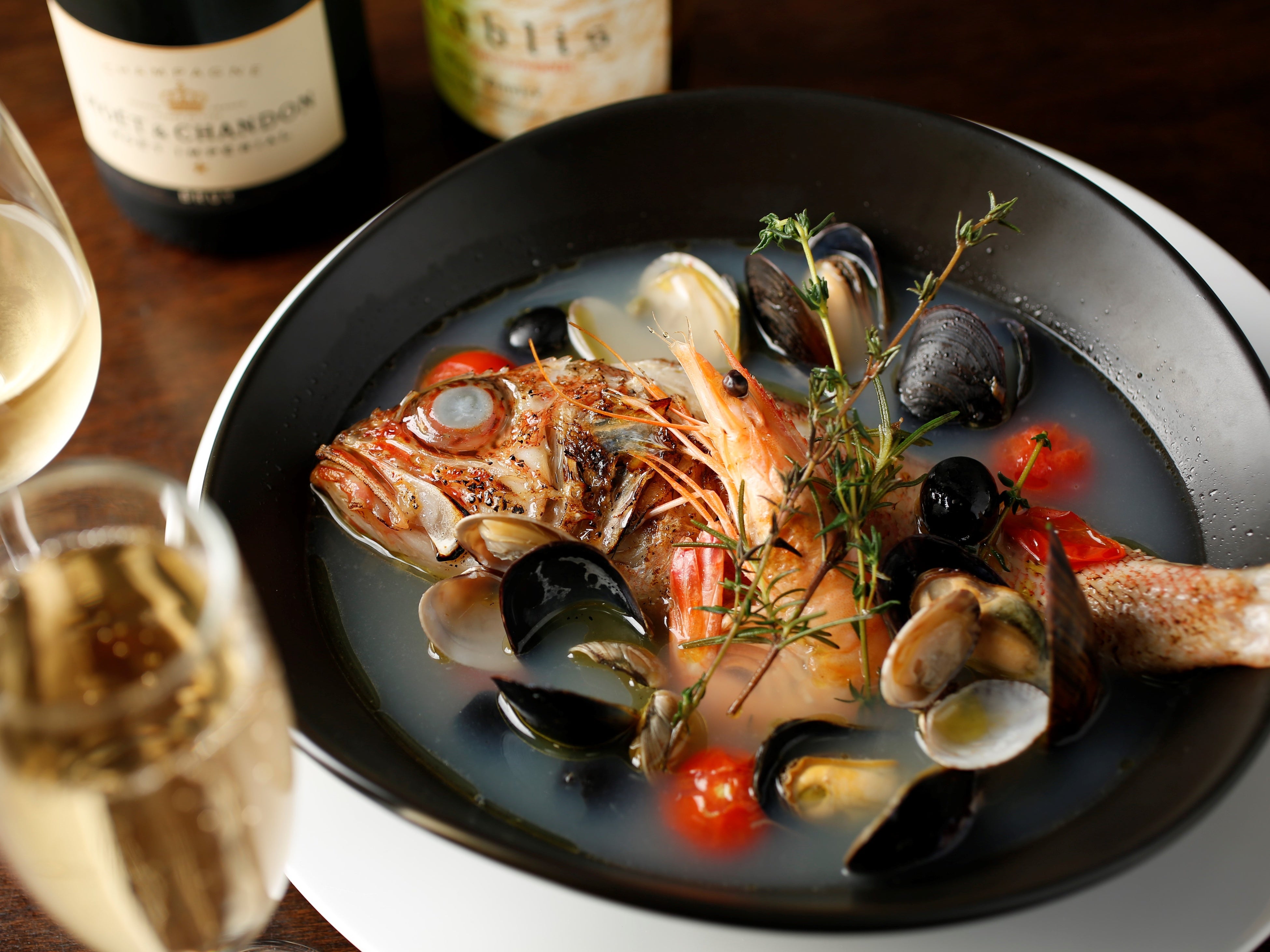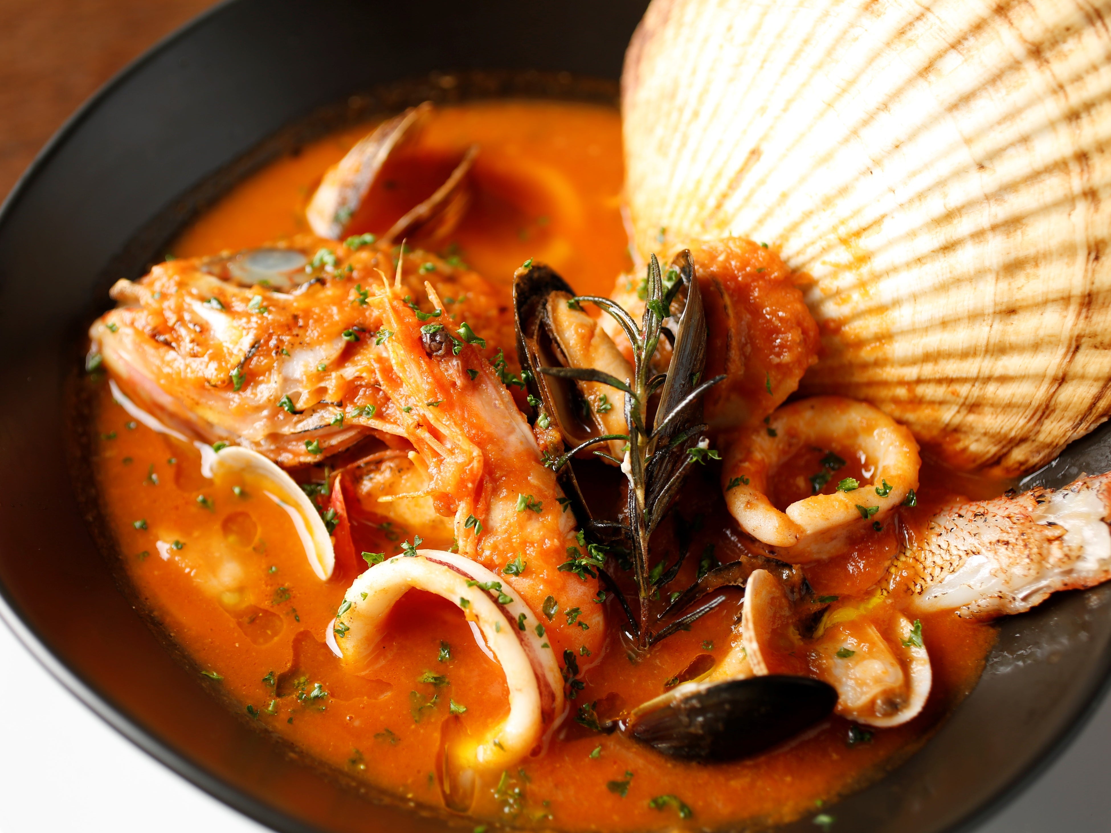 魚貝の旨味たっぷりのブイヤベースのこだわりメニュー「濃厚ホワイトブイヤベース1,750円」。フランスの郷土料理コトリアードをお楽しみいただけます。