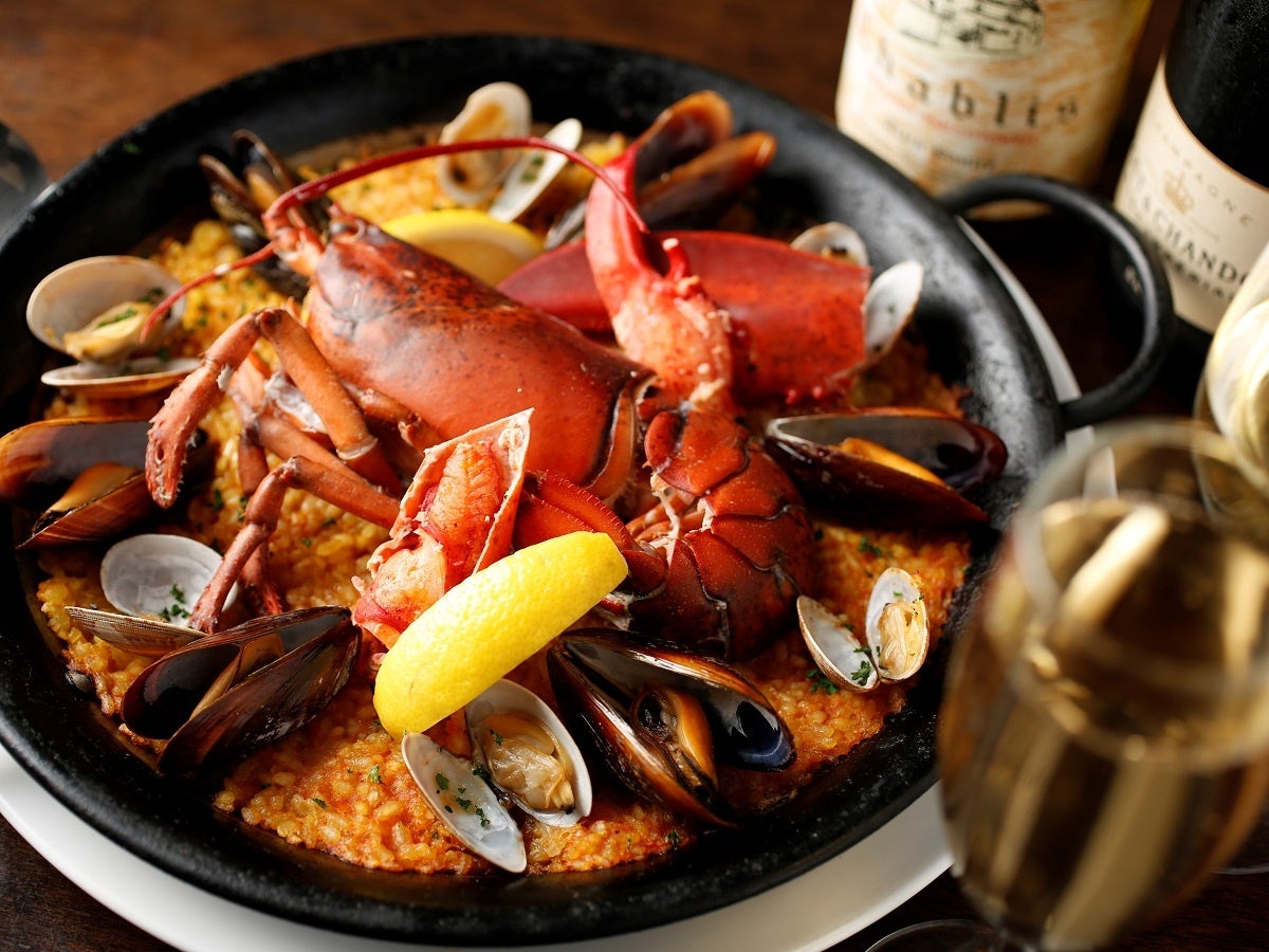 オマール海老と魚貝、香辛料でとったフォンでじっくりと炊き上げた「オマール海老のパエリア3,800円」は、汁気を多く残して仕上げる国産米メロッソ仕上げ。