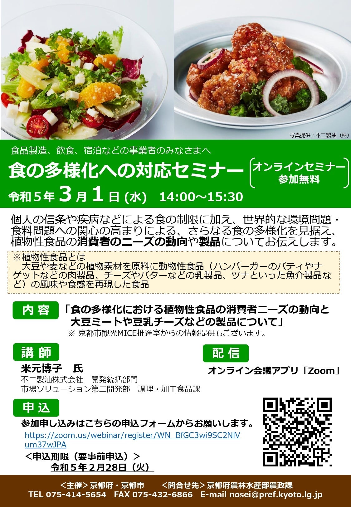 近年、個人の信条や疾病等の理由による食に制限がある人の増加や、世界的な環境問題・食料問題への関心などを背景に、食へのニーズは多様化しています。そこで、今回、府内の食品製造、飲食、宿泊施設等事業者を対象に、食の多様化に関する今後の市場の動向等、知識の向上を図るためのセミナーを開催します。是非ご参加ください。(※事前のお申し込みが必要です。)