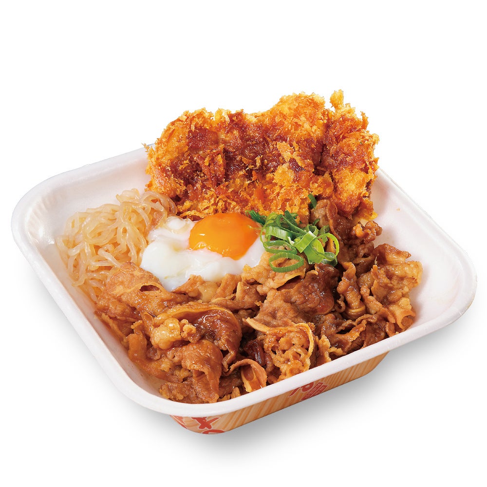 これまで販売した実績と比較して牛肉量を20%増量し割り下を一新した牛すき焼きは、甘みと牛肉の旨味が相まってご飯のおかずとしてそのままはもちろん、次に合い盛りにしたサクサク衣のチキンカツと一緒に頬張り、さらに卵をからめて味わいの変化を楽しみながらお腹も満足する一品です。