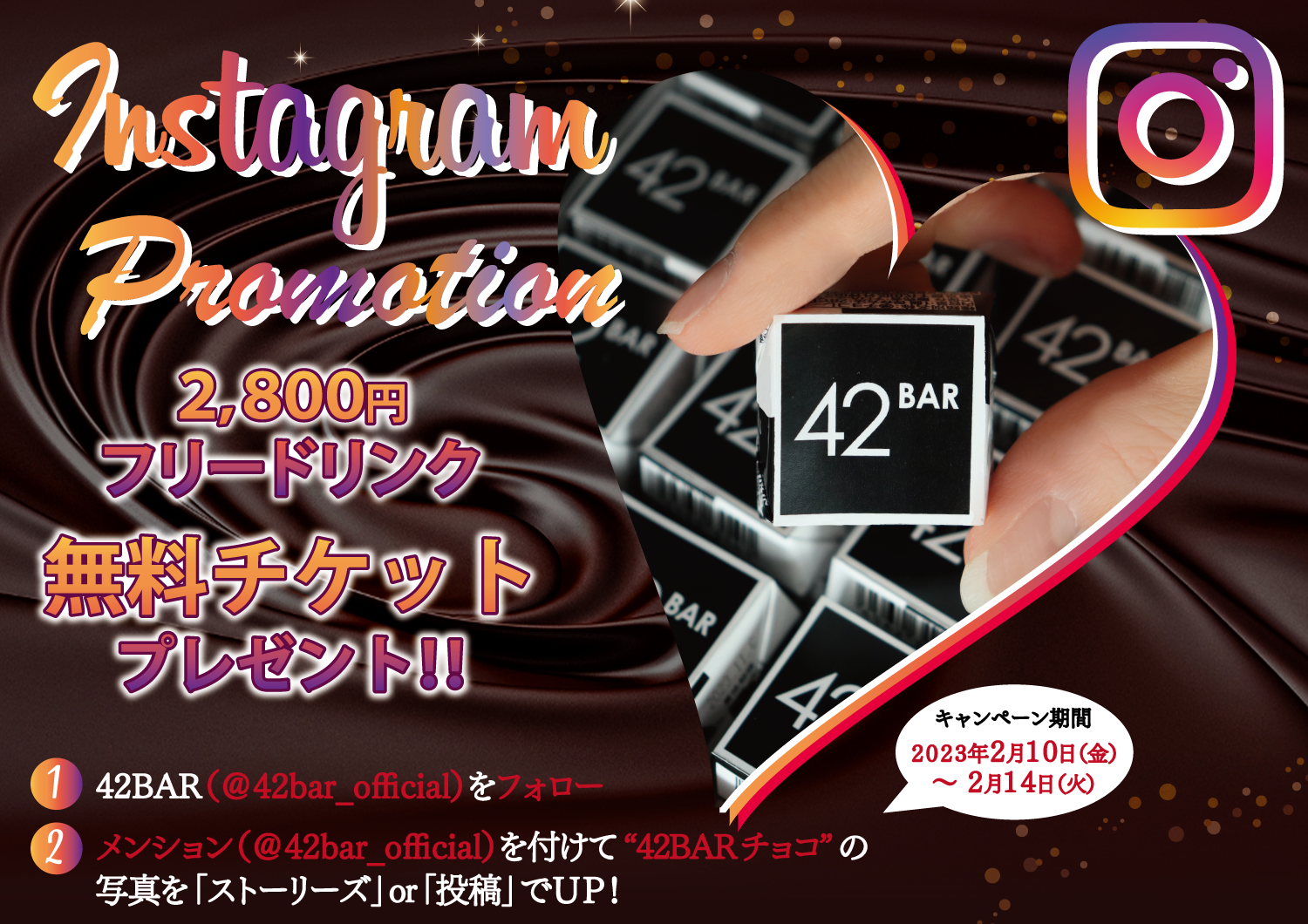 ■Instagramキャンペーンは2023年2月10日(木)~2023年2月14日(火)まで実施。オリジナルチョコレートの投稿をして抽選で2800円のコースが無料になるキャペーン。