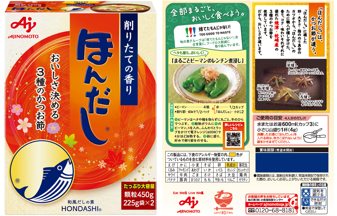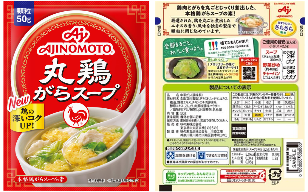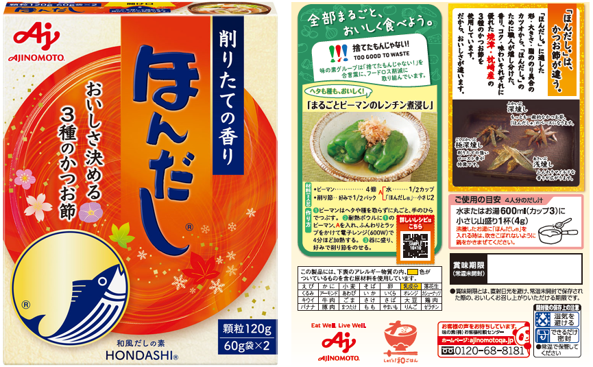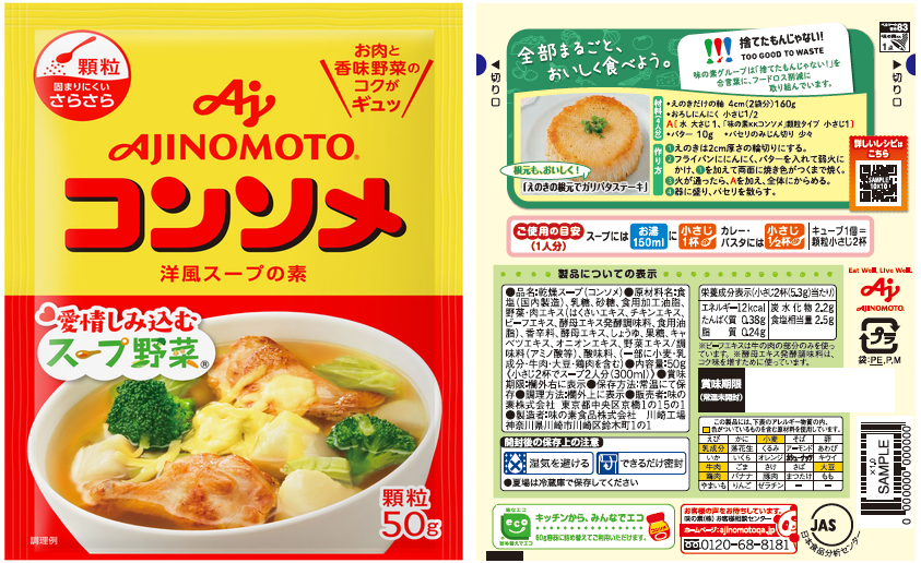 この度、オンラインのみならず、生活者との最⼤の接点である商品を通じて同取り組みを広めていくため、「ほんだし®」、「丸鶏がらスープ™」、「味の素KKコンソメ」のパッケージ裏面で「TOO GOOD TO WASTE~捨てたもんじゃない!~」を紹介する製品を発売します。