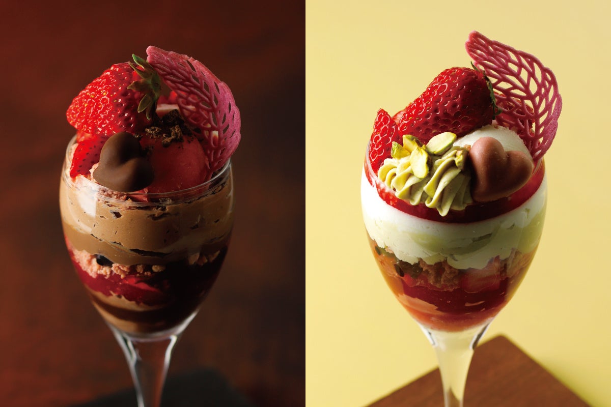 濃厚なチョコレートに京いちごの酸味が溶け合う『京いちごとチョコレートのパフェ』、コクのあるピスタチオのレアチーズに甘酸っぱい京いちごが際立つ『京いちごとピスタチオのパフェ』。