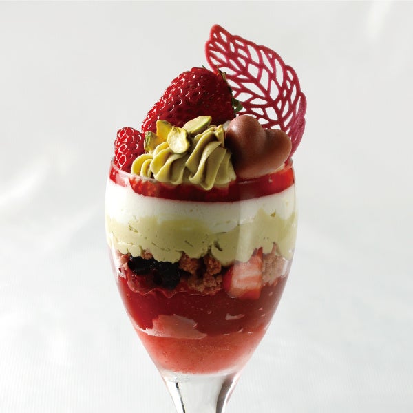 北海道産のクリームチーズにコクのあるピスタチオを練り込んだクリーミーなレアチーズ。みずみずしい京いちごの甘酸っぱさが際立つ、春の訪れを感じさせる爽やかなパフェに仕上げました。