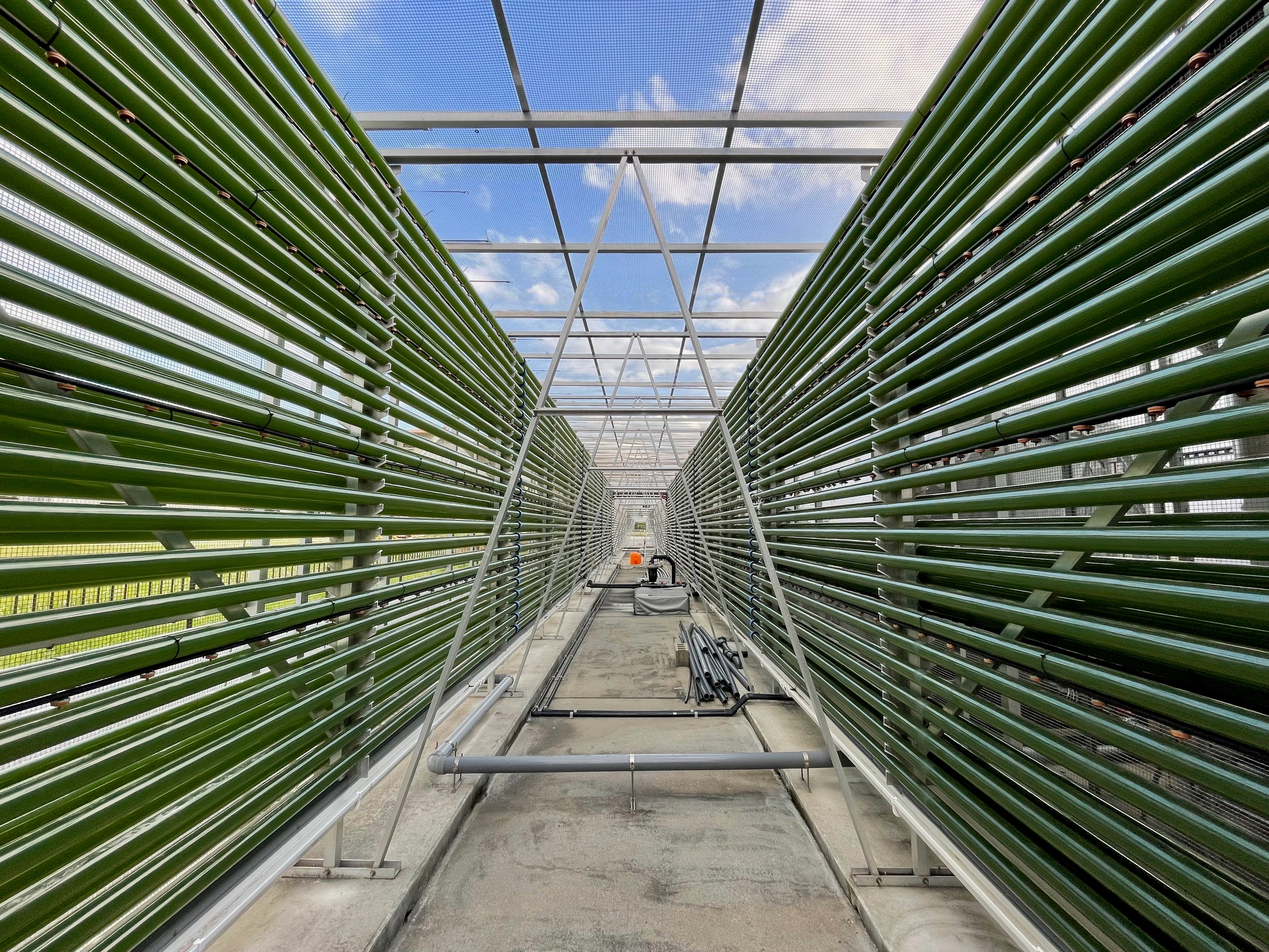 当社では、フォトバイオリアクターを用いることにより世界で初めてパブロバの高密度安定生産に成功しました。現在、国内最大規模のガラスチューブ型のフォトバイオリアクターで、沖縄の天然海水および太陽光を利用して生産しています。
