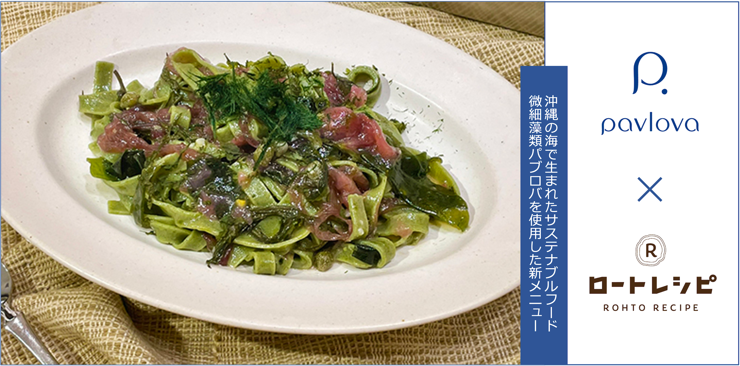 この度、ロート製薬が⼿がける『おなかの底から元気になれる』をブランドコンセプトにした「ロートレシピ」の旗艦店「ロートレシピ茶屋町店」にて、パブロバパスタを使⽤した「海藻のペペロンチーノ (パブロバ藻のフェットチーネ)」をディナーメニューとして提供いただくことになりました。また、「パブロバ」を使⽤したドレッシングもセットサラダにてお楽しみいただけます。
