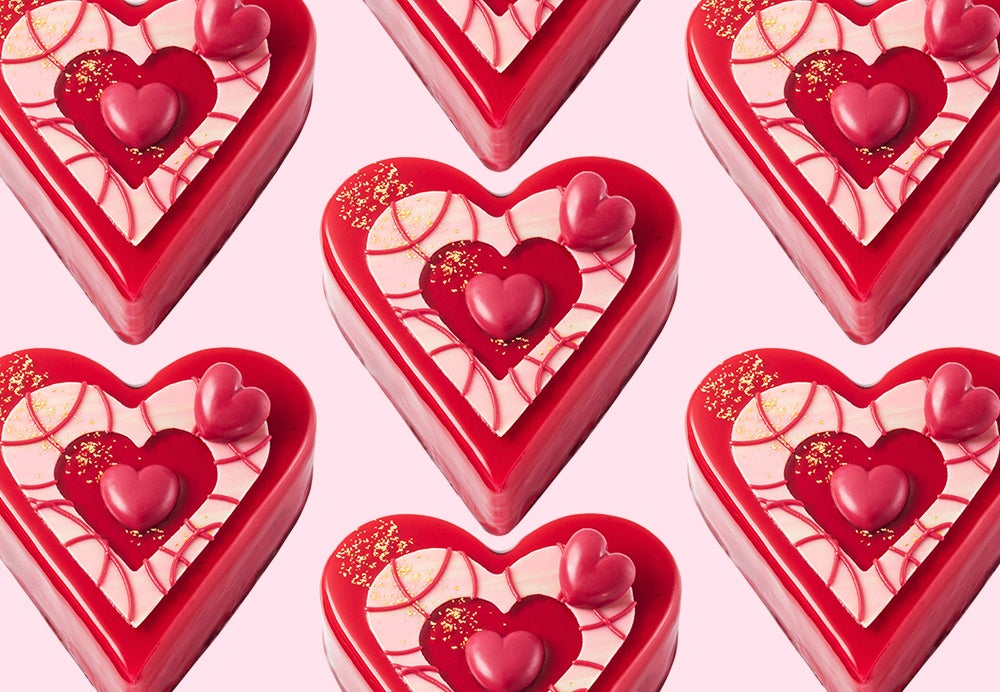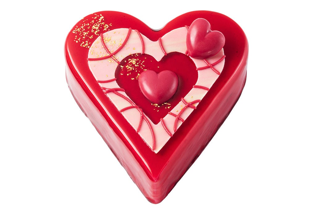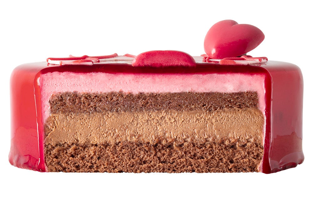 『ルビー色のショコラハート』はカラメル風味のシロップが染み込んだ「ショコラスポンジ」をベースに、濃厚なコクがとろけだす「ショコラムース」と きゅんと甘酸っぱい「フランボアのムース」を重ねています。その上から真っ赤なグラサージュを流しかけて、ルビー色の輝きをまといました。