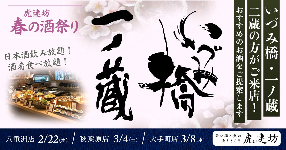 2023年度第1弾として、都内3店舗限定で開催する「春の酒祭り」は宮城県より『一ノ蔵』と神奈川県より『いづみ橋』に来店いただきます。造り手の話を聞き、呑み比べながら、酒の産地に寄り添った酒肴ビュッフェと共に日本酒を飲み放題で思う存分お楽しみいただけます。