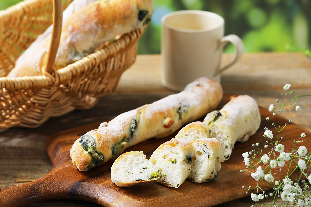 旬を迎えた菜の花を使用したフランスパン。ちょっぴり大人な味わいの菜の花と相性がいいベーコンを組み合わせました。春の訪れをお楽しみいただける、期間限定のフランスパンです。