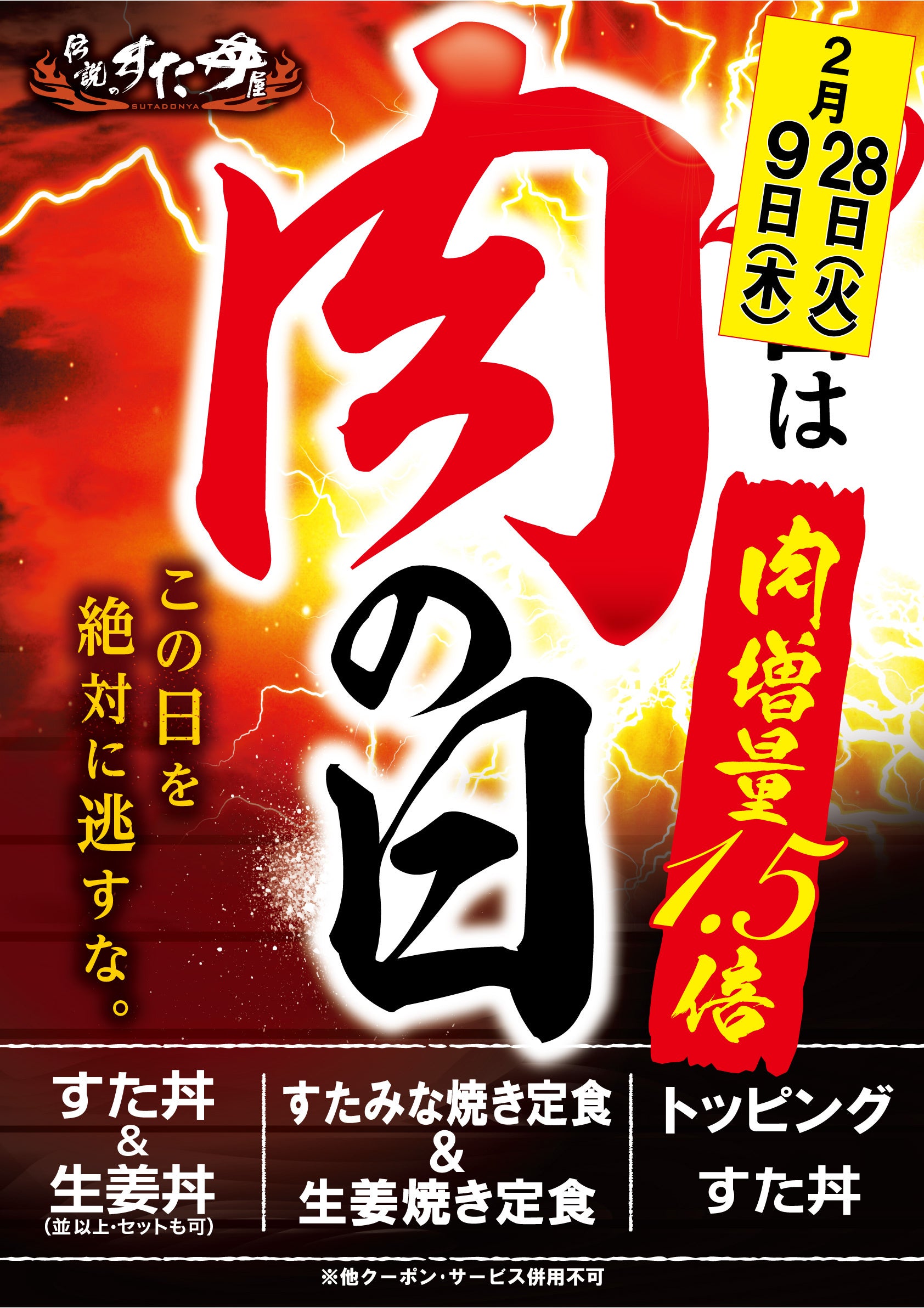 1月末より食品・飲料といった4000品目超の生活必需品が2月から値上げするという報道がなされ、家計消費や経済に対する不安が広がっています。当店では『食を通じて、日本全国さらには世界の人々の底力となる』という企業理念のもと、食品の値上げが続いてお客様が大変な状況だからこそ、肉&ニンニクパワーですたみなをつけて頑張って欲しいという考えから、例年2月は29日が無いため2月28日に『肉の日キャンペーン』を実施していた計画を急遽2月9日にも開催することを決定いたしました。この機会にこれでもかというほど、秘伝のニンニク醤油ダレのパンチが効いたすた丼屋のお肉を存分にご堪能いただき、すたみなをつけて頑張っていきましょう!