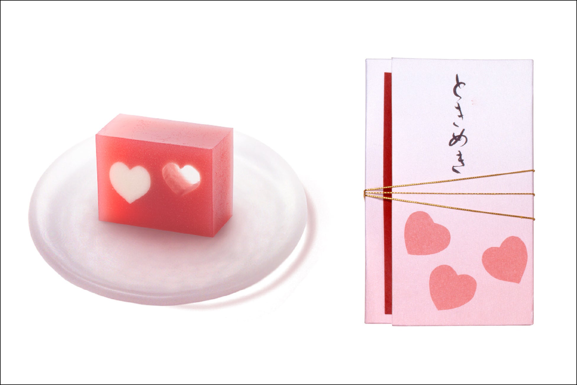 かわいらしいピンクの羊羹にこめたのは、清楚なホワイトのハート、きらりとピュアに透きとおるハート。あっさりとした紅羊羹に、2種のハート形が浮かぶ意匠羊羹です。