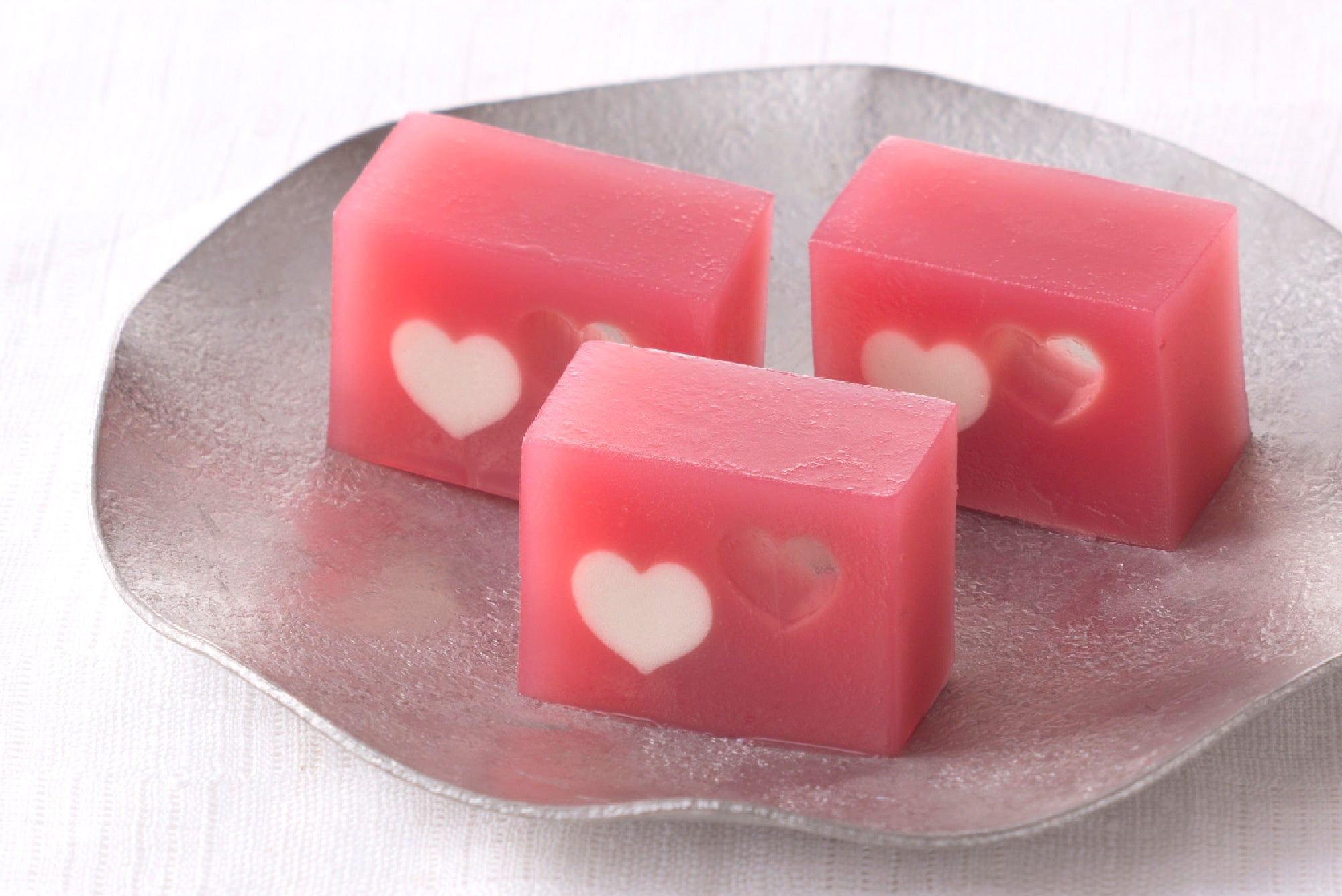 かわいらしいピンクの羊羹にこめたのは、清楚なホワイトのハート、きらりとピュアに透きとおるハート。あっさりとした紅羊羹に、2種のハート形が浮かぶ意匠羊羹です。