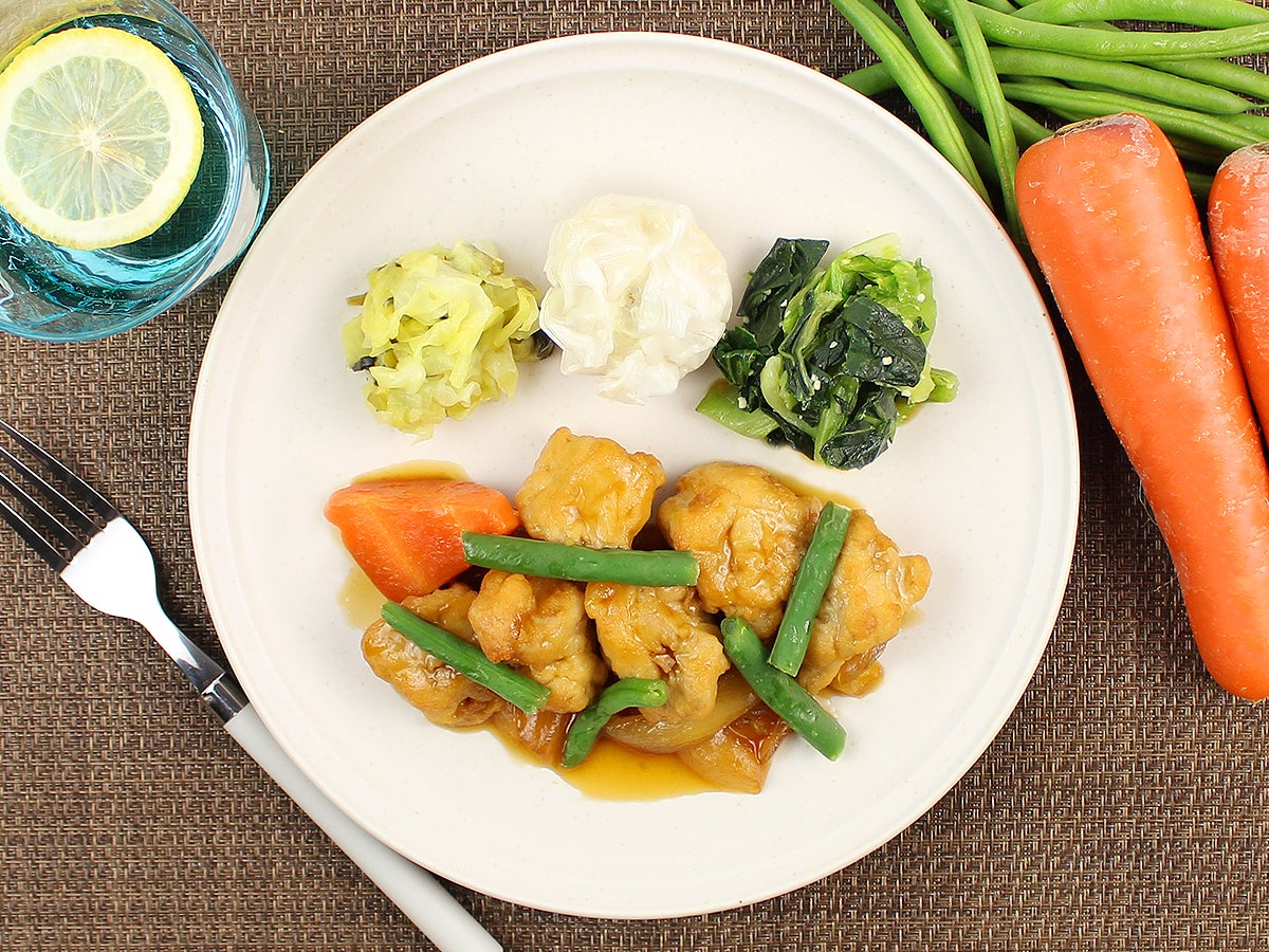カラっと揚げた三元豚のからあげと、ニンジン、タマネギ、インゲンをさっぱりと食欲のそそる甘酸あんと共にお召し上がりいただく酢豚です。