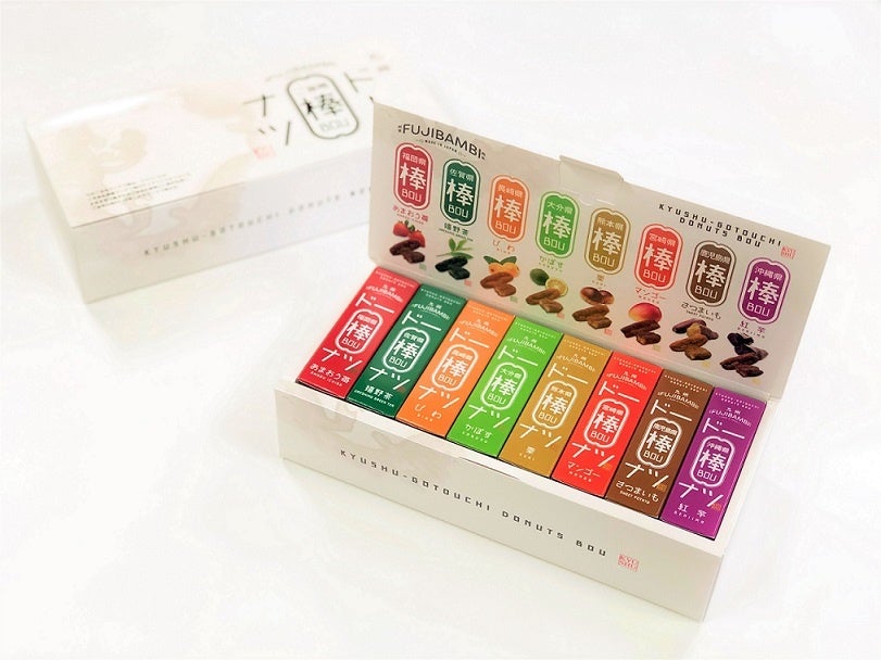 九州各県と沖縄のご当地ドーナツ棒として、「福岡県 あまおう苺」「佐賀県 嬉野茶」「長崎県 びわ」「大分県 かぼす」「熊本県 栗」「宮崎県 マンゴー」「鹿児島県 さつまいも」「沖縄県 紅芋」の8種類をアソートセットにしました。