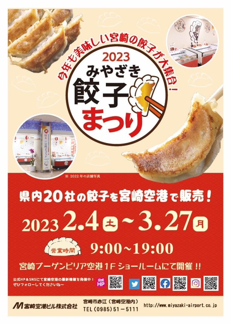 宮崎ブーゲンビリア空港にて、県内20社の餃子が大集合。本年2月4日(土)から3月27日(月)、毎日9時~19時、空港ビル1階ショールームにて開催しております。どうぞお立ち寄りください。