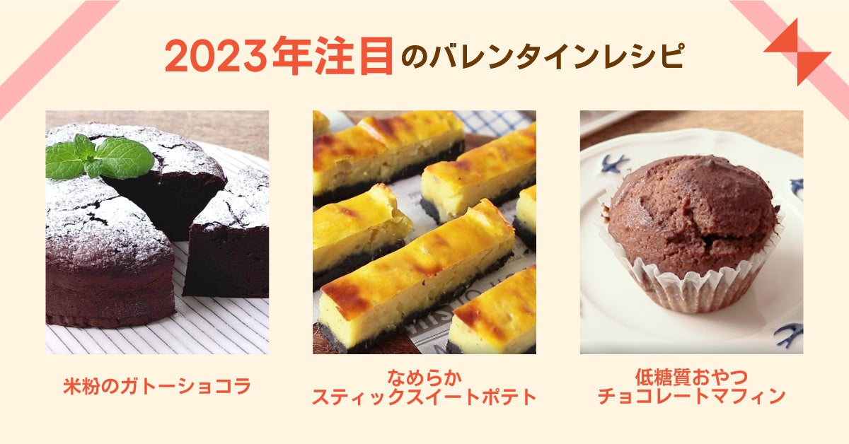 2022年9月から特に検索を伸ばしており、2023年のバレンタインに多く作られることが予想されるのは「米粉」「さつまいも」を使用したレシピ、または「低糖質・低カロリー」なレシピです。