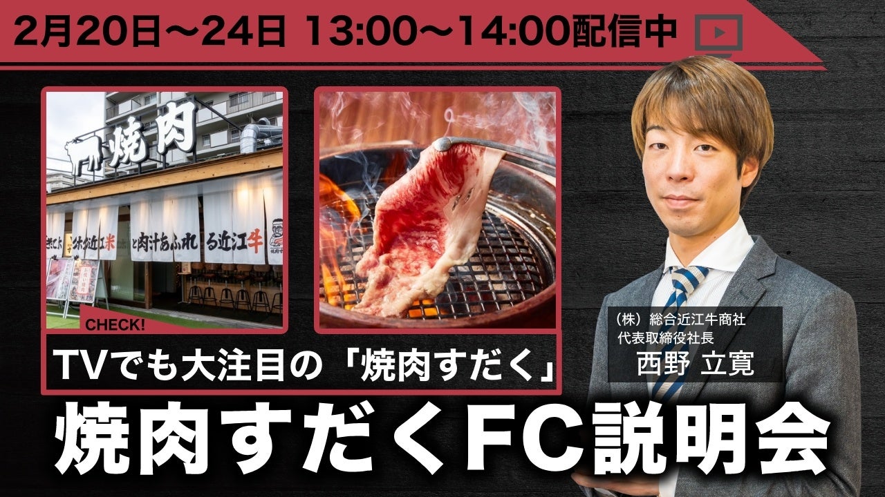 株式会社総合近江牛商社(本社:滋賀県栗東市/代表取締役社長:西野 立寛)が展開する「焼肉すだく」は、2019年の滋賀県にて1号店を出店し、現在は日本各地で展開するファミリー型の焼肉店です。 この度、2月20日(月)~2月24日(金)にかけて、「焼肉すだくFCオンライン説明会」を開催します。