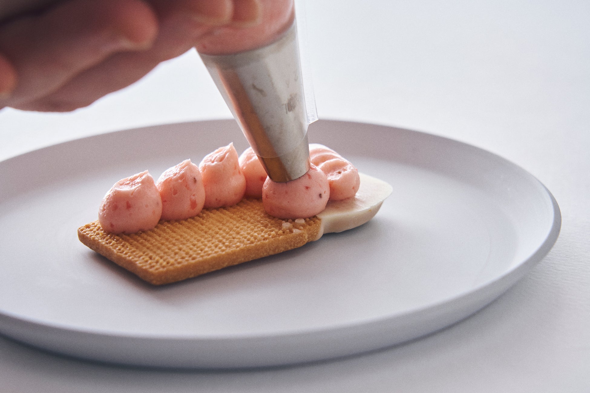 試作を何度も重ね完成した、瑞々しくいちごの味が溶け込んだ口どけなめらかな生バタークリーム。コクのある強い甘みをもつ古都華でつくった果肉たっぷりの自家製いちごジャムに、北海道産バターと生クリームのホイップを丁寧に混ぜ合わせ、隠し味にホワイトバルサミコビネガーを加えています。そうすることで、いちごのコクと甘みがより引き立てられ、古都華ならではのいちごの旨みをシンプルに楽しめるお菓子ができあがりました。