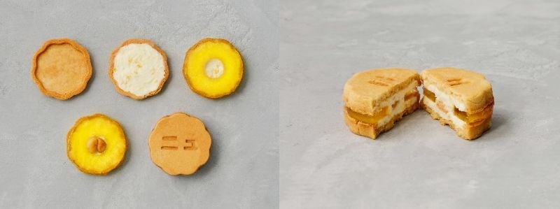 石垣島産のティダパインを使用したパート・ド・フリュイ、マンゴー顆粒とチョコ配合のクリーム、マカダミアナッツを、店頭で1枚ずつ焼き上げる黒糖配合のタルトで挟んでいます。