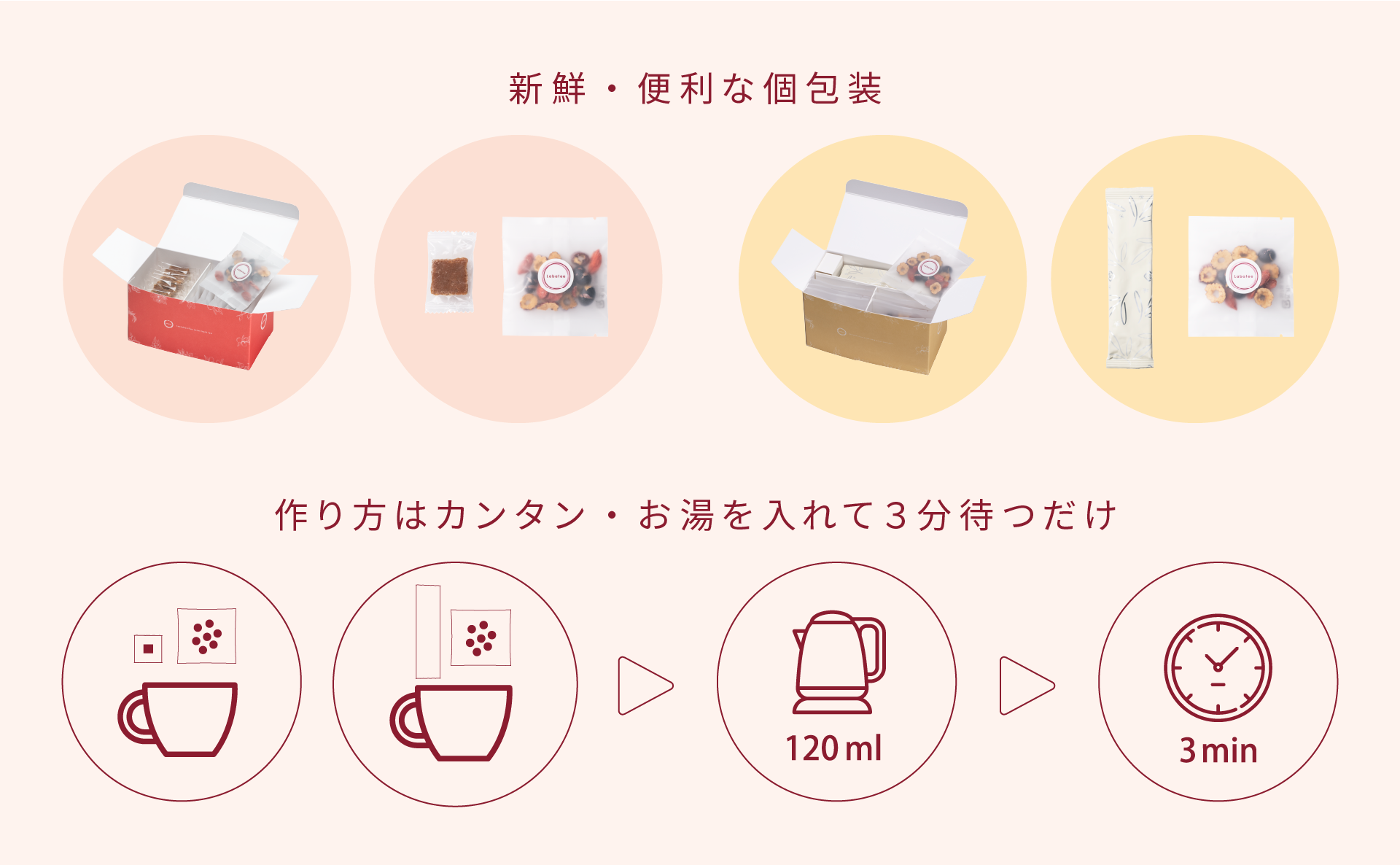 このような課題を解決するためにLabatee〈ラバティー〉では、和漢素材本来の美味しさを最大限に引き出しながら、「お茶」といったような日本人が普段から慣れ親しんだ形で手軽に和漢素材を摂ることができるような商品の開発に取り組んでいます。また、事前に最適なバランスでブレンドされた和漢素材を計量が不要で持ち運びにも便利な個包装にするなど、商品設計の細部にまで手軽さを感じて頂ける工夫を施しています。