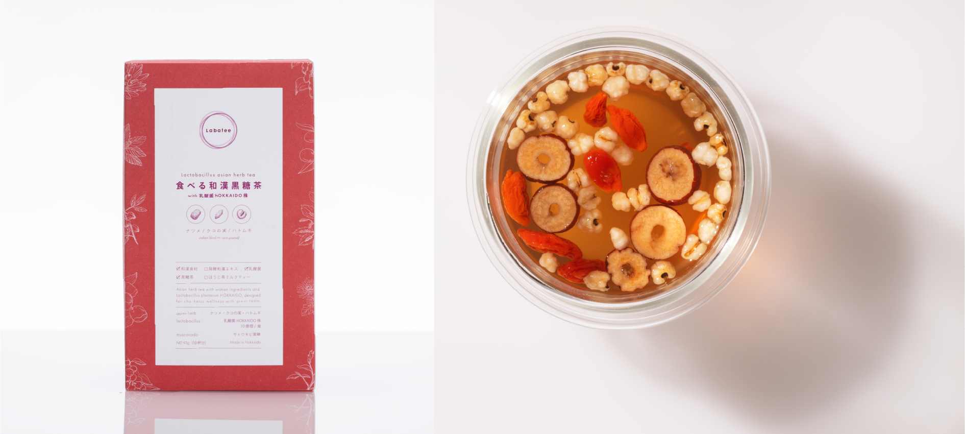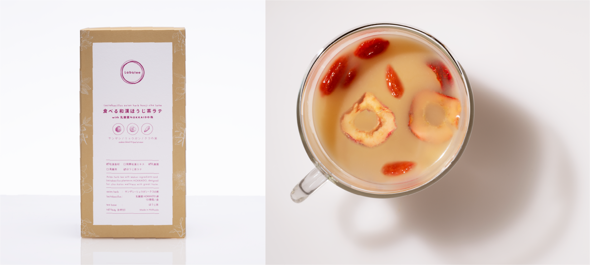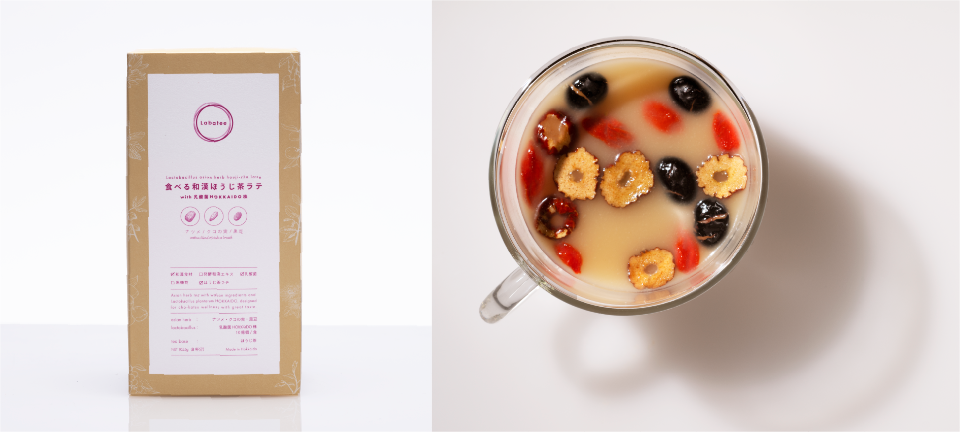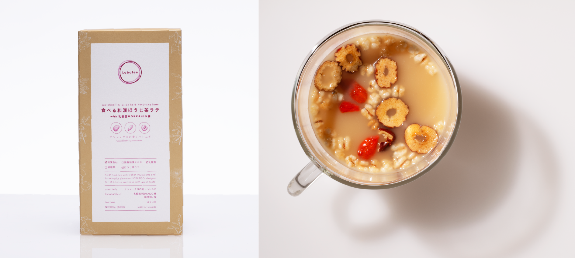 香ばしさの中にまろやかさとすっきりとした苦味・甘みを感じさせる乳酸菌入りほうじ茶ラテをベースに3種類の和漢素材をブレンドした新感覚の食べるお茶。
