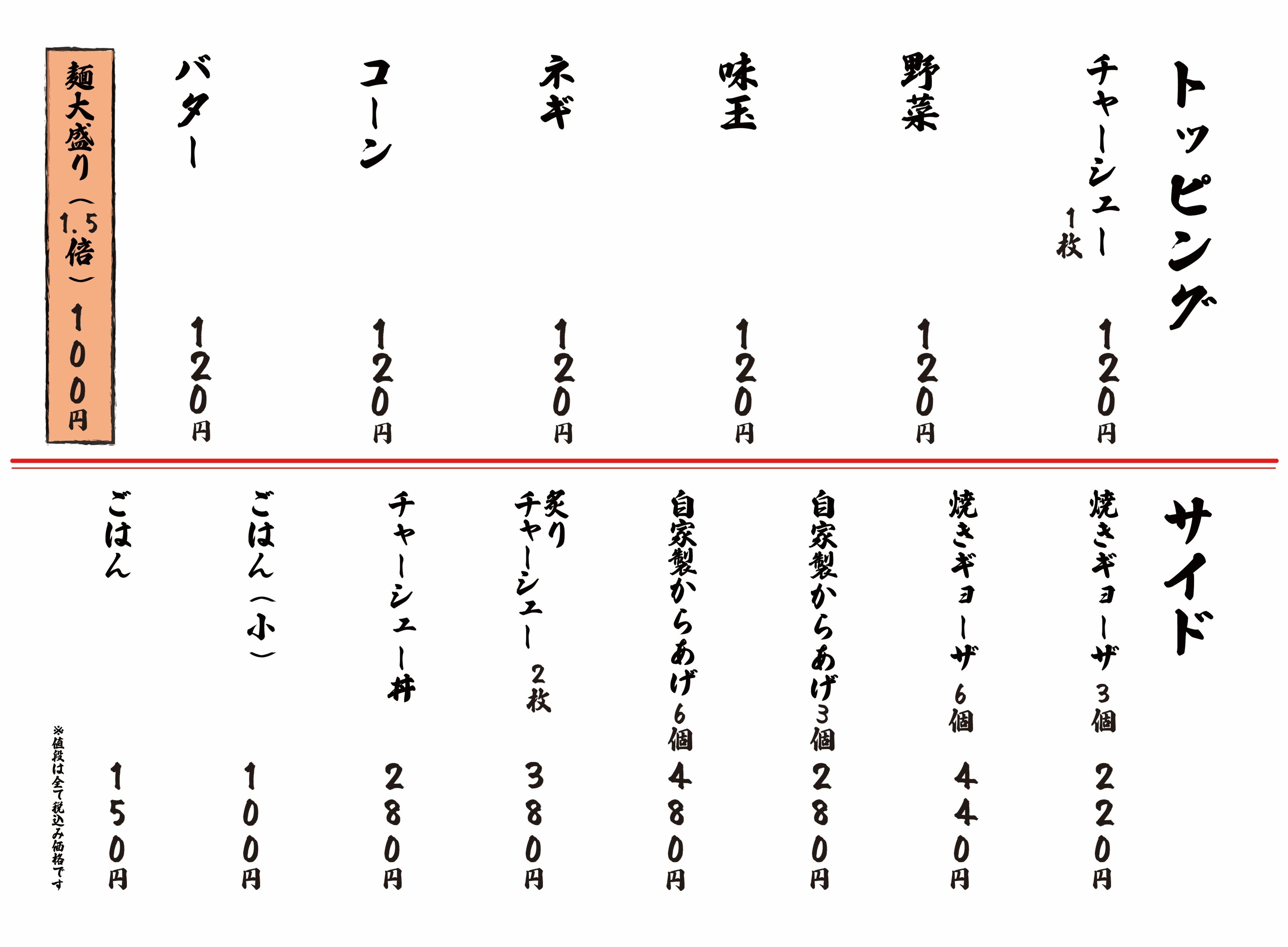 *この他に、麺が半分で代わりに味玉が付いた「ミニ味噌ラーメン(780円)」や、おにぎり付きの「お子様ラーメン(350円)」、お得なセットメニュー「からあげセット(からあげ2個+ライス)」「ギョーザセット(ギョーザ3個+ライス)」「チャーシュー丼セット」(各250円)各種トッピングなどもご用意しております。