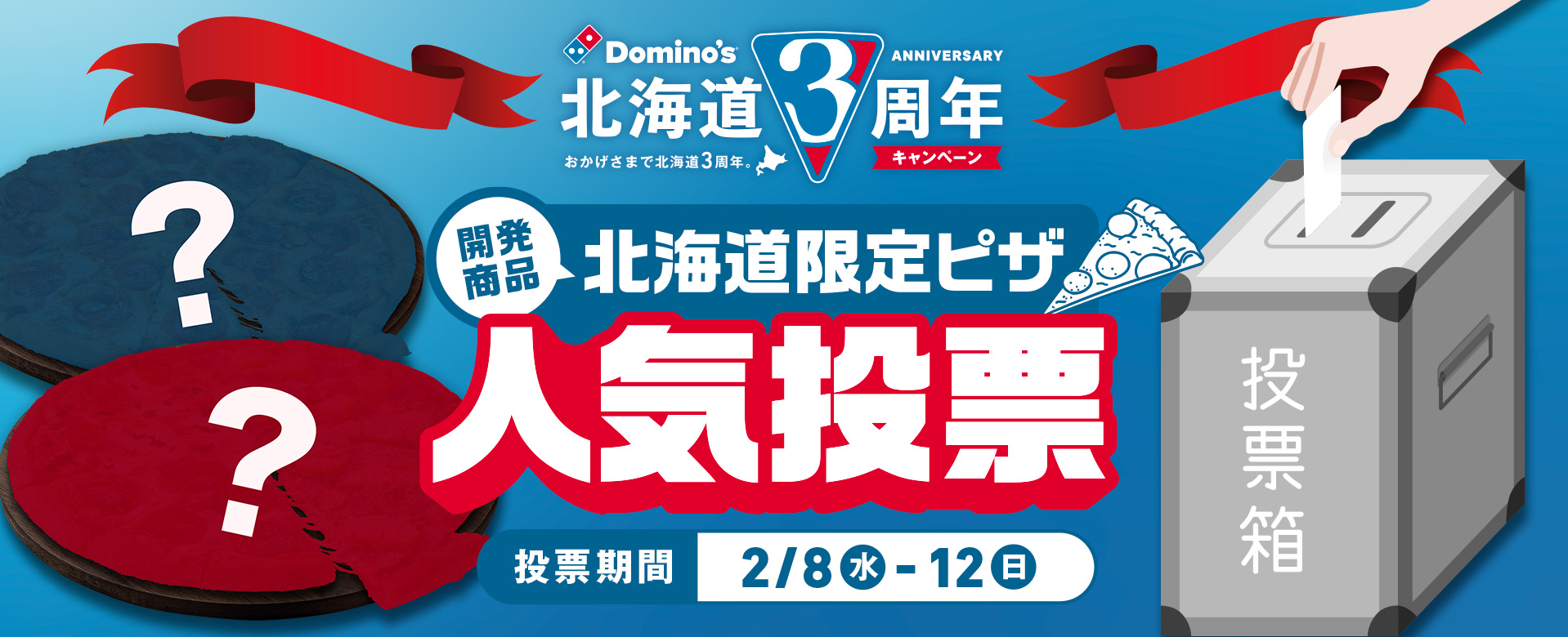 株式会社ドミノ・ピザ ジャパン(代表取締役:ジョシュア・キリムニック、CEO:マーティン・スティーンクス、本社:東京都品川区)が展開する国内No.1シェアを誇る宅配ピザチェーン ドミノ・ピザは、「北海道3周年記念キャンペーン」の一環として、北海道を4つの地区に分け、地元のお客様とともにピザを開発する『北海道限定商品開発プロジェクト』を進行しています。